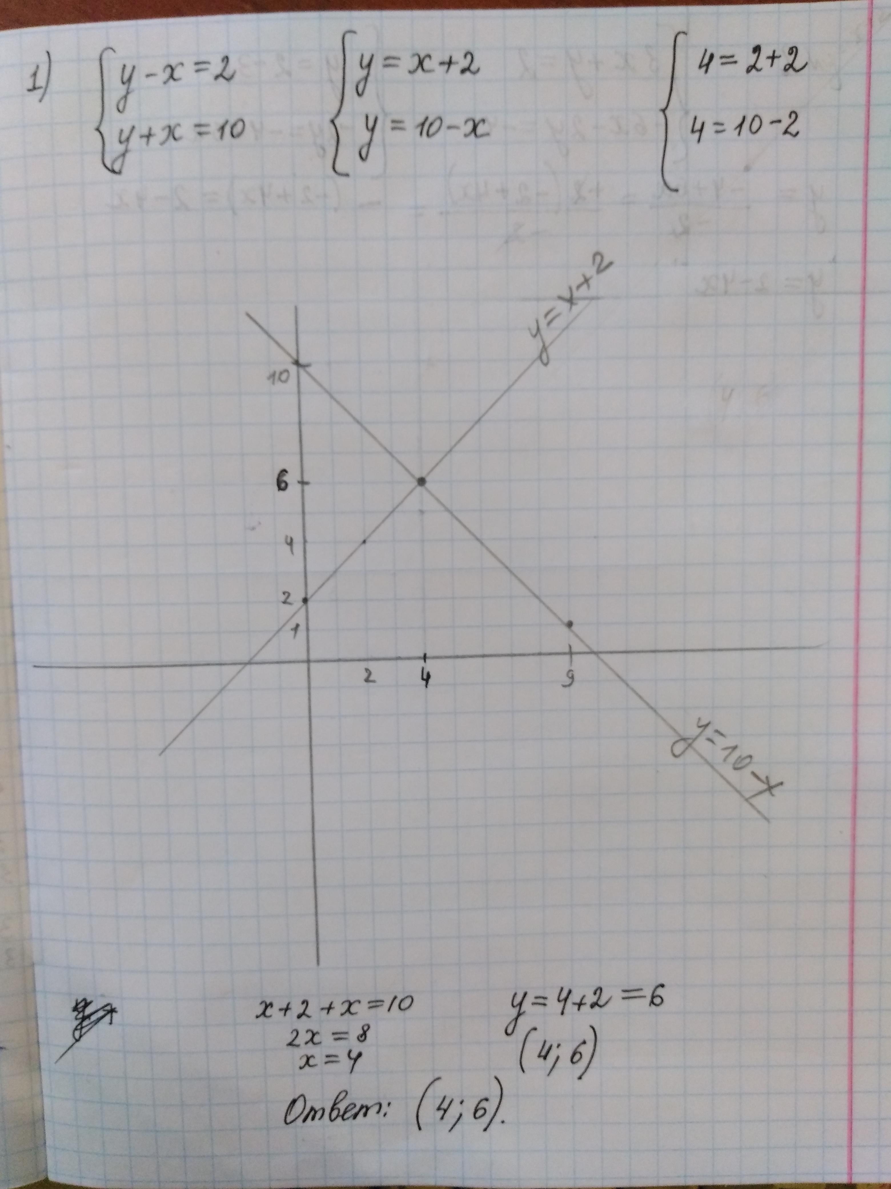 Точка пересечения линейных графиков (4;6). Это и будут корни уравнения.