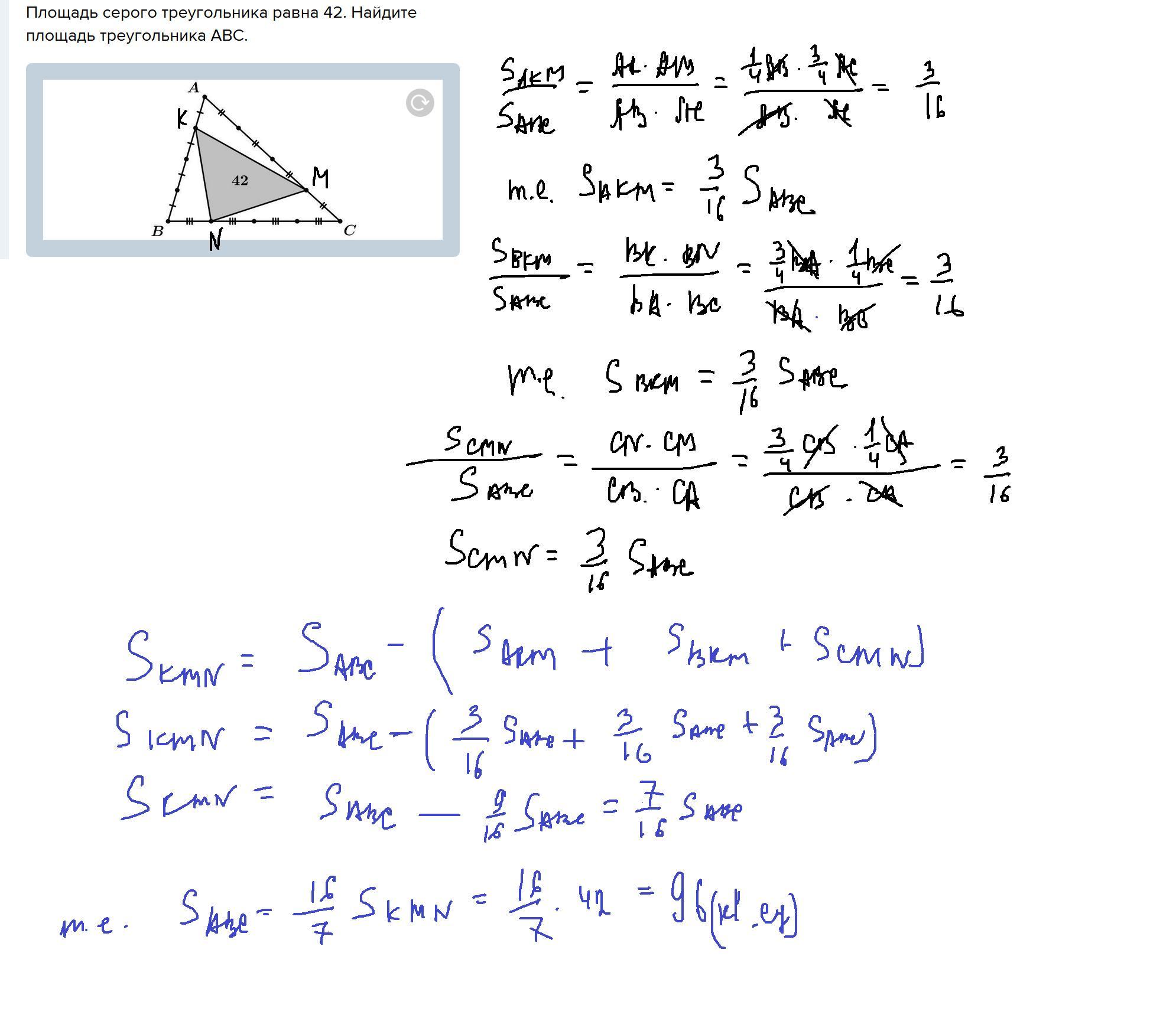 Площадь серого треугольника равна 42. Найдите площадь треугольника ABC.