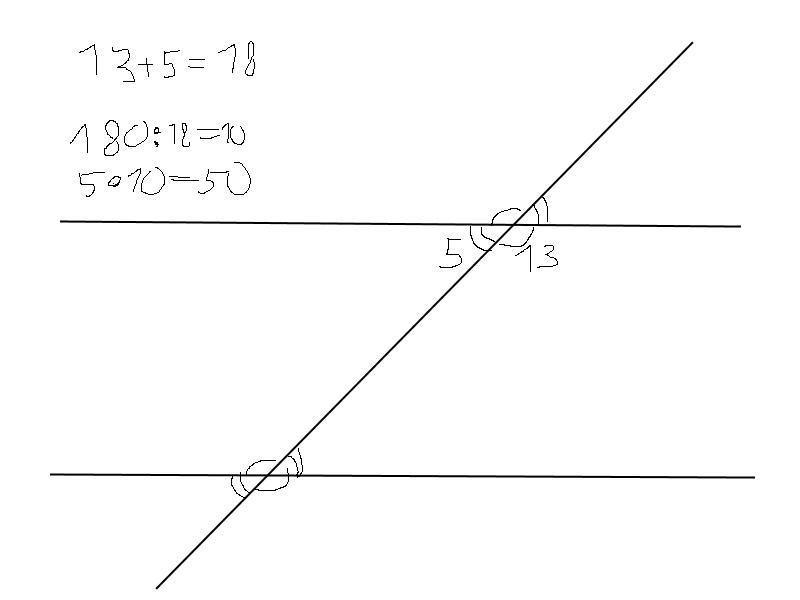 при пересечении двух параллельных прямых третьей образовалось 8 углов два их них относятся как 5:13. укажите величину меньшего угла