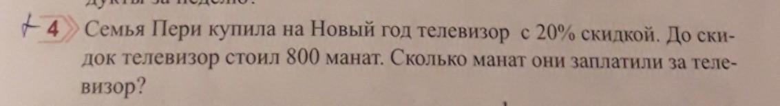Семья Пери купила на Новый год телевизор с 20% скидкой . До скидок телевизор стоил 800манат . Сколько манат они заплатили за телевизор .