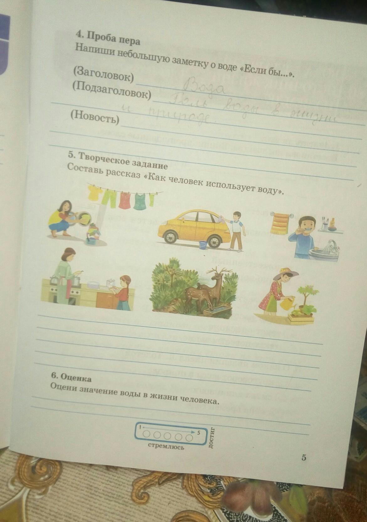 каждый день человек вставая чистит зубы, на завтрак выпивают стакан воды, поливают растение, стирает вещи,моет машину, делает чай ну и поит своих домашних животных