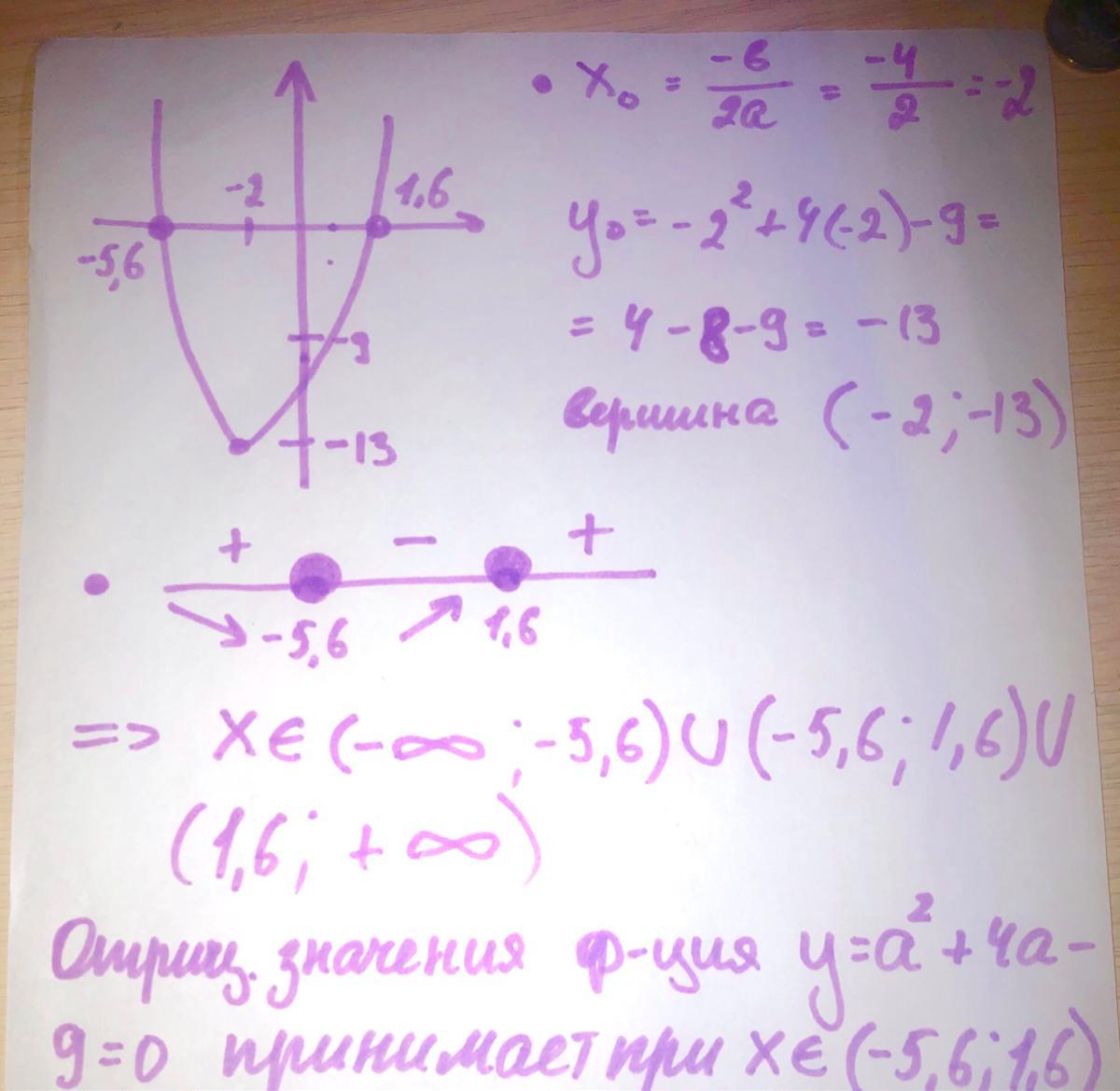 - Дальше мы должны построить график, так как данное уравнение относиться к уравнению параболы и при старшей степени(там где х^2) стоит знак плюс, то парабола будет иметь ветви направленные вверх(см вложение) с точками пересечения оси х в 1,6 и -5,6