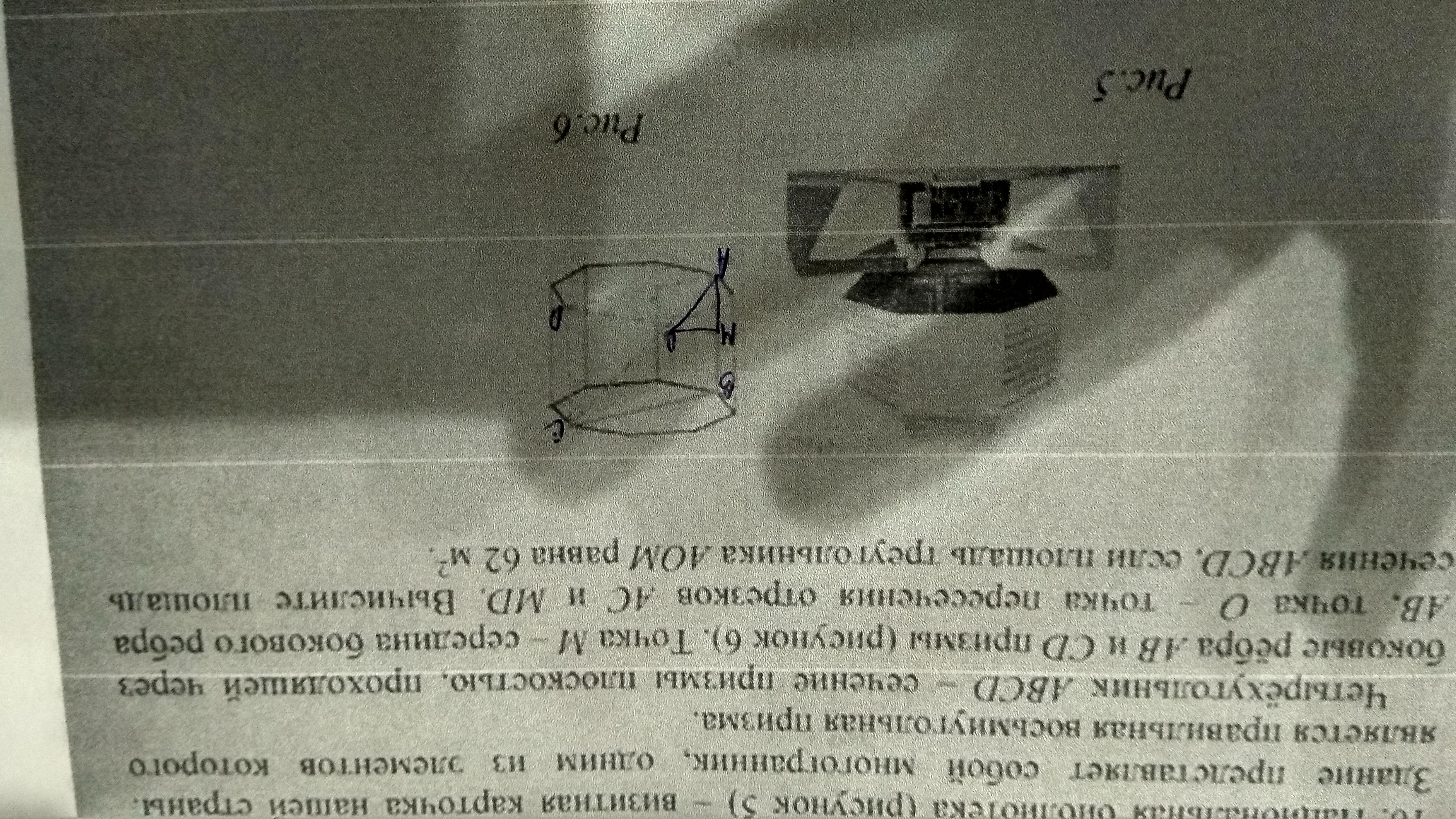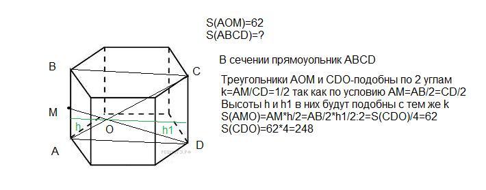Четырехугольник АBCD - сечение призмы плоскостью, проходящей через боковые ребра АВ и СD призмы. Точка М - середина бокового ребра АВ, точка О - точка пересечения отрезков АС и МD. Вычислите плошадь сечения АBCD, если площадь треугольника АОМ равна 62м²