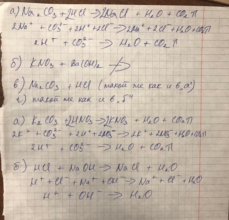 Составьте по схемам уравнения возможных реакций и запишите их в молекулярном и ионном виде.а) карбонат натрия+соляная кислота=; б) нитрат калия+гидроксид бария; в)карбонат натрия+соляная кислота=;г)нитрат калия+гидроксид бария=;. Запишите молекулярные и полные ионные уравнения реакций, сущность которых выражена схемами а)2H+ + СO32– = H2O + СO2↑; б)2H+ + 2OH– = 2H2O