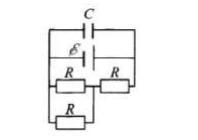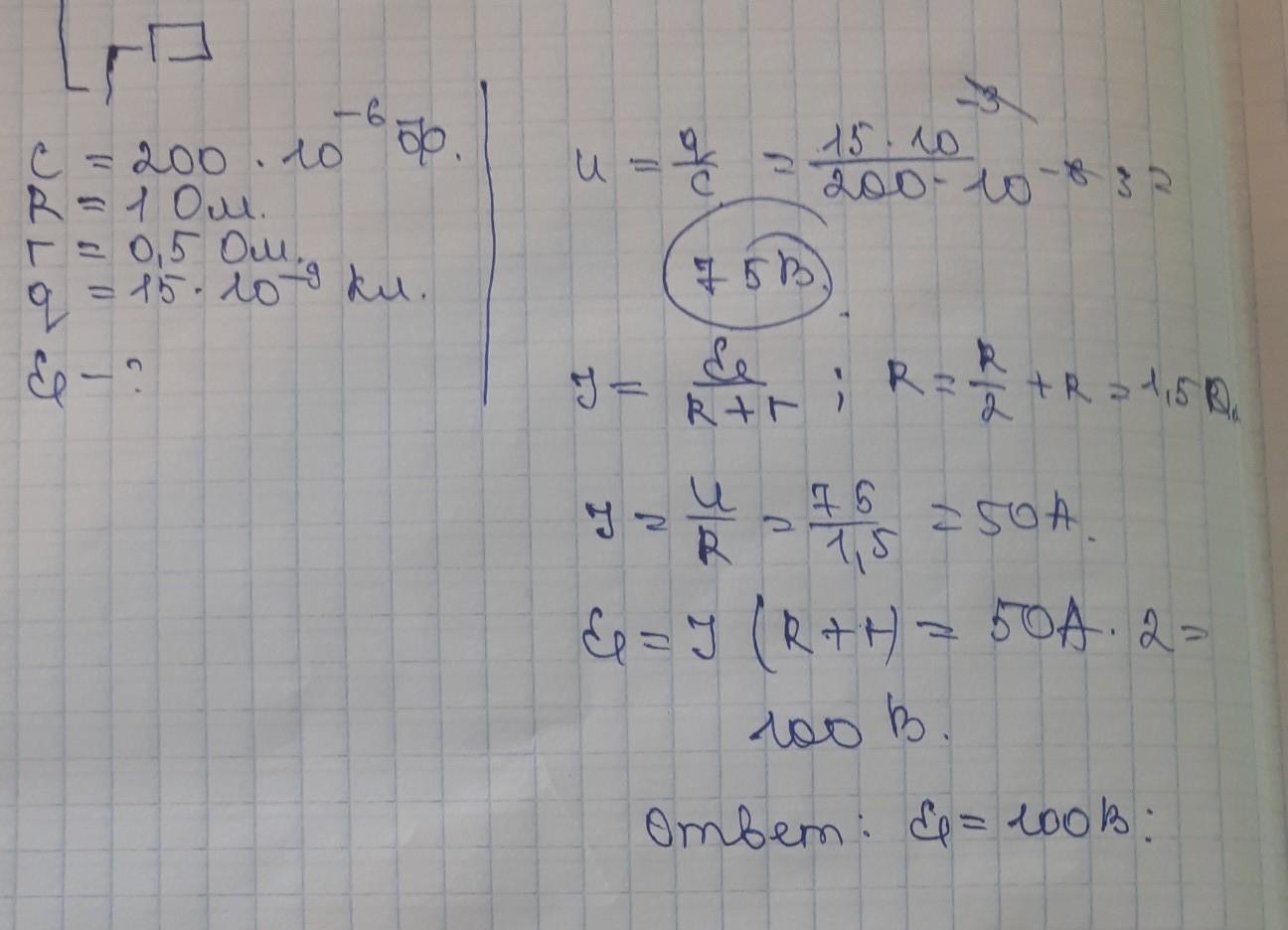 Определите ЭДС источника, если конденсатор емкостью C = 200 мкФ имеет заряд q = 15 мКл, сопротивление каждого из резисторов R = 1 Ом, а внутреннее сопротивление источника r = 0,5 Ом (см. рисунок).