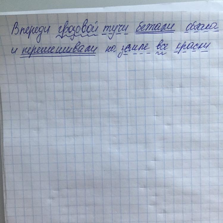 Облака-подлежащее, бежали и перемешивали-однородные сказуемые. Впереди-обстоятельство места, грозовой-определение, тучи-дополнение, и-союз, на земле-обстоятельство места, все-определение, краски-дополнение. [= —, =]. Повесь., невоскр., простое, двусост, распрост., осложнено однородными сказуемыми.