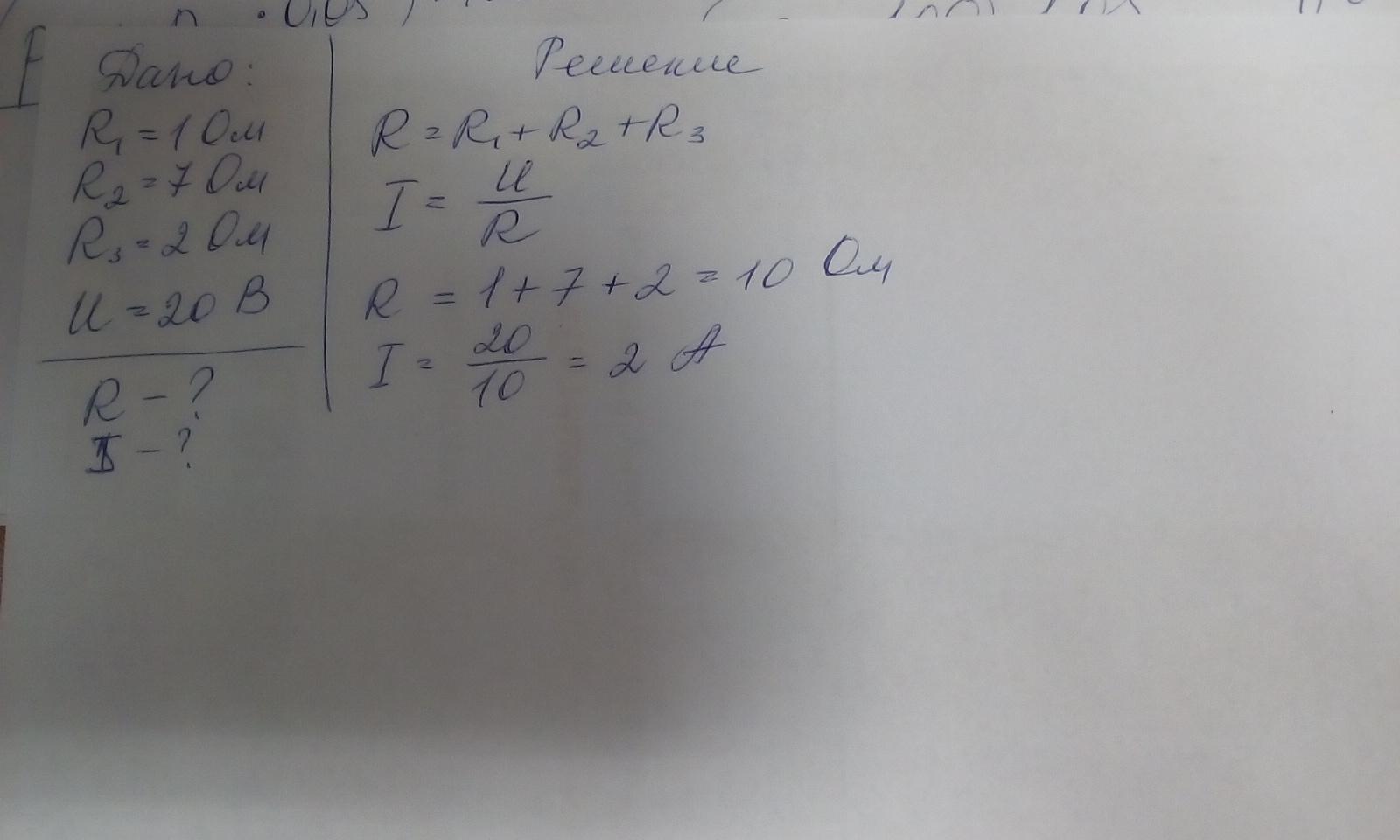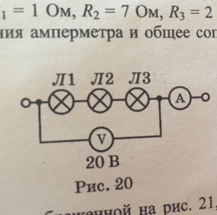 Три лампочки, соединенные последовательно, имеют сопротивления R1=1 Ом, R2=7 Ом, R3=2 Ом (рис. 20). Определите показания амперметра и общее сопротивление электрической цепи.