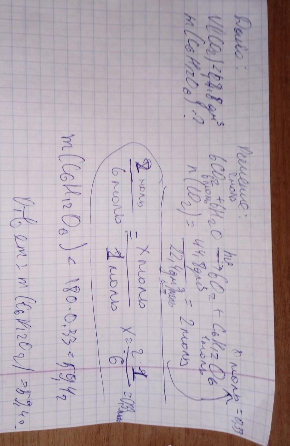 В процессе фотосинтеза растение поглотило оксид углерода(lV) объёмом (н.у.) 44,8 дм3. Вычислить массу образовавшейся глюкозы
