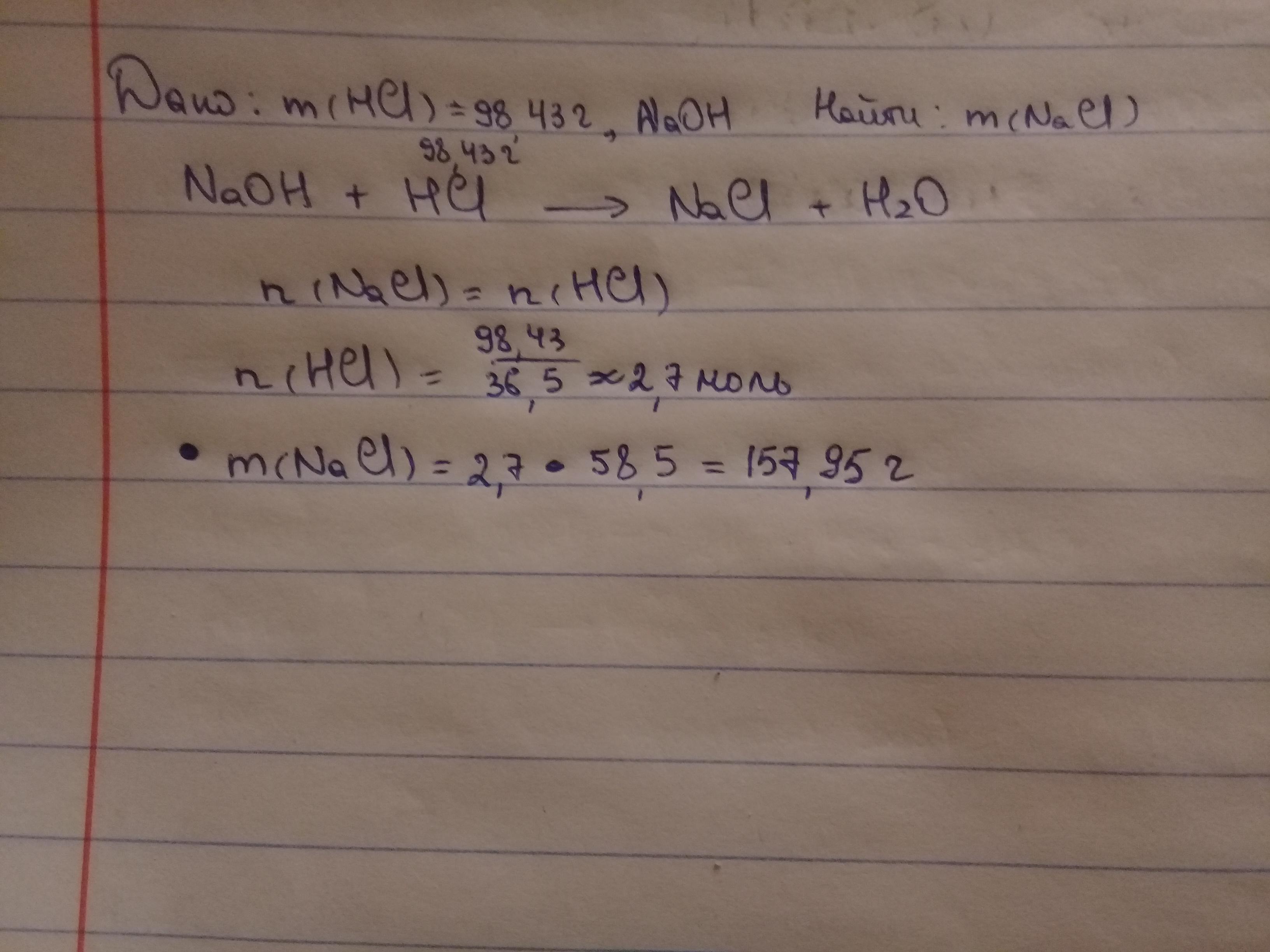 На нейтрализацию раствора NaOH потребовалась соляная кислота массой 98,43г. Найдите массу образовавшегося NaCl