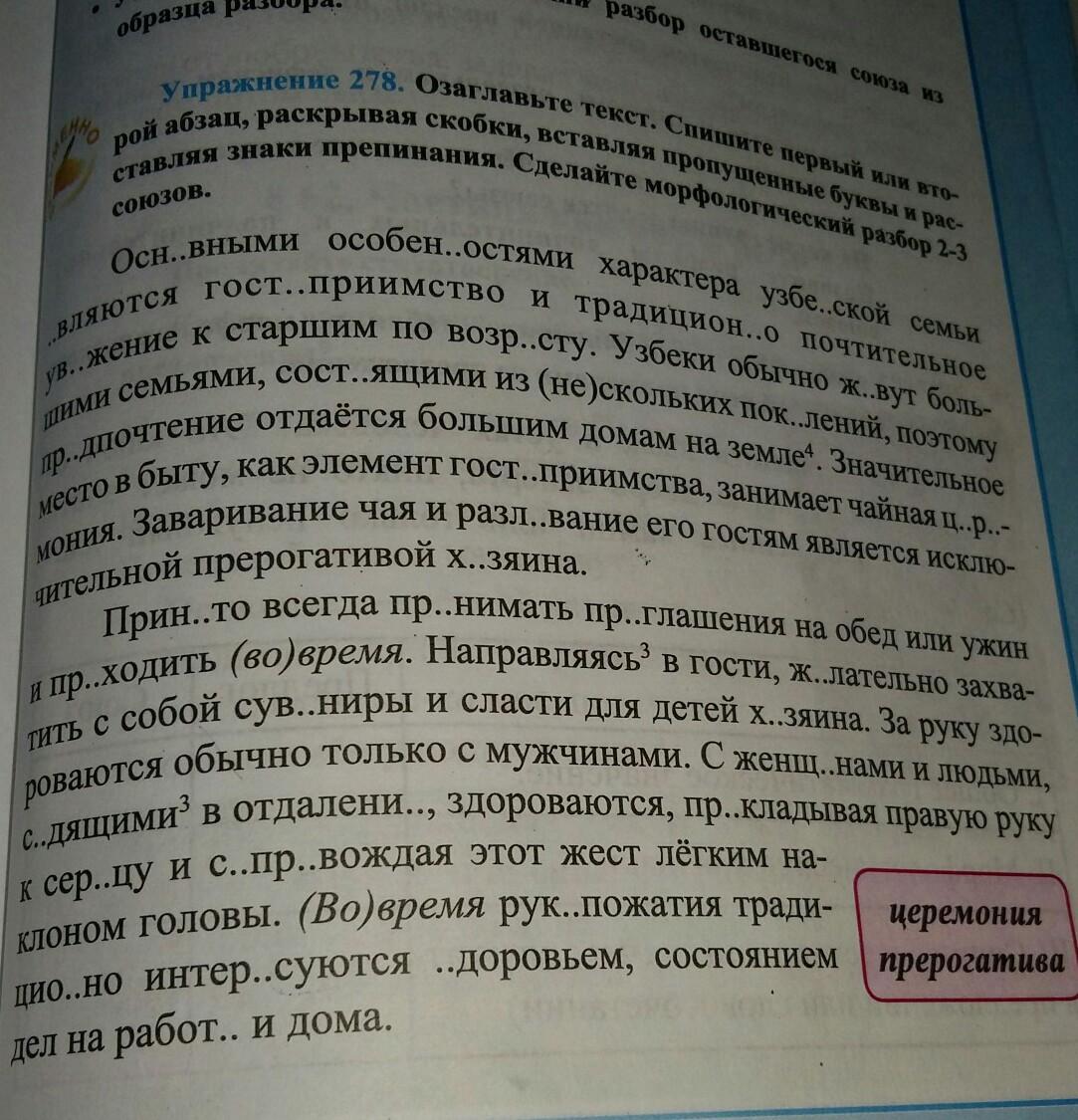 Основными особенностями характера узбекской семьи является гостеприимство и традиционно почтительное уважение к старшим по возрасту. Узбеки обычно живут большими семьями, состоящими из нескольких поколений, поэтому предпочтение отдается большим домам на земле. Значительное место в быту, как элемент гостеприимства, занимает чайная церемония. Заваривание чая и разливание его гостям является исключительной прерогативой хозяина.