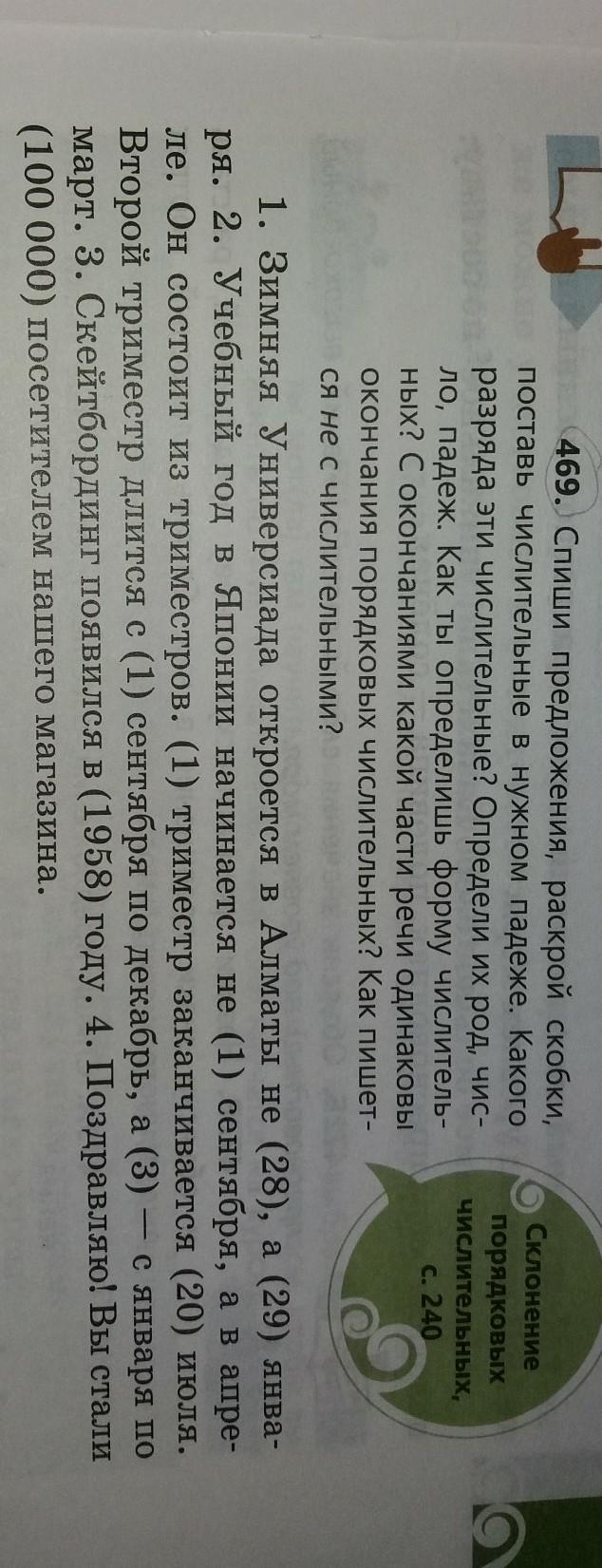 Зимняя Универсиада откроется в Алматы не двадцать восьмого, двадцать девятого января. Учебный год в Японии начинается не первого сентября, а в апреле.Он состоит из триместров. Один триместр заканчивается двадцатого июля. Второй триместр длится с первого сентября по декабрь, а третий - с января по март. Скейтбординг появился в одна тысяча девятьсот пятьдесят восьмом году. Поздравляю! Вы стали сто тысячным посетителем нашего магазина.