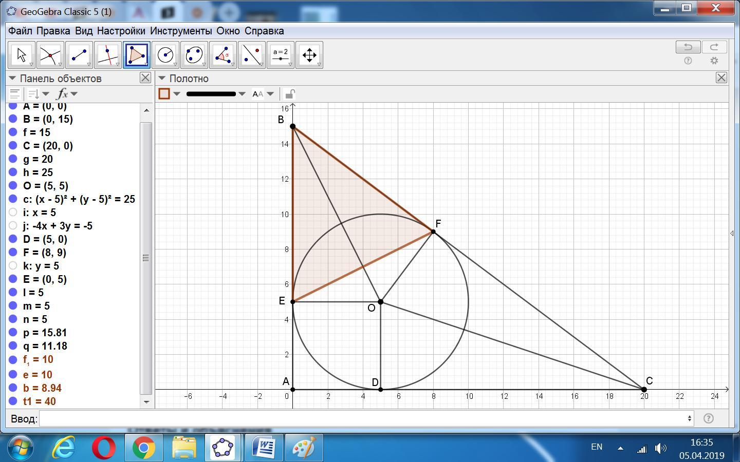 BE = AC*tgC - R = 20*(3/4) - 5 = 15 - 5 = 10. tg(B/2) = 5/10 = 1/2.