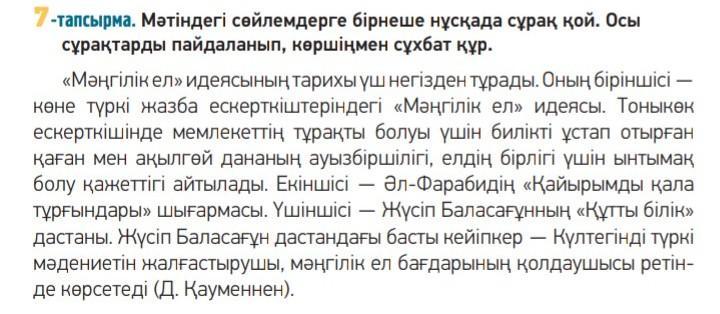 2.Оларды ата? (1-түркі жазба ескерткіштеріндегі-<мәңгілік ел> идеясы, 2-Әл-Фарабидың <қайырымды қала тұрғындары> шығармасы, 3-Жүсіп Баласағұнның <құтты білік> дастаны)