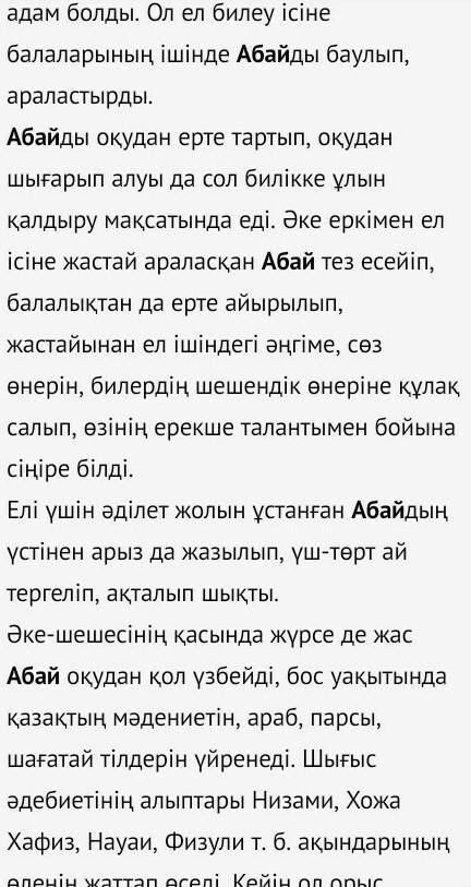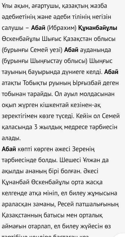 Абай Кунанбаев поэт, композитор, мыслитель, основоположник казахской письменной литературы. Родился в 10 августа 1845 года, а умер 6 июля 1904 года. Настоящее имя Ибрагим. Родился в Чингизской волости, в семье крупного бая Кунанбая Оскенбаева. С 13 лет отец Кунанбай начинает приучать Абая к деятельности главы рода. В возрасте 28 лет Абай отходит от неё, целиком занявшись самообразованием, но только к 40 годам создаёт свои первые взрослые стихотворения.Абаем создано около 170 стихотворений и 56 переводов, написаны поэмы, «Слова назидания» («Қара сөздер»).Абай был также композитором. Он создал около двух десятков мелодий, которые популярны в наши дни.