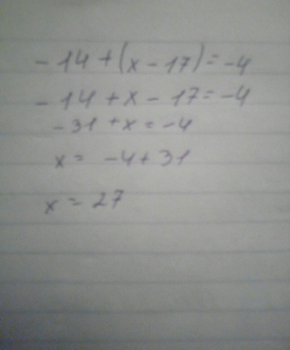 Для начала нужно раскрыть скобки там, где они стоят. Получится вот так: -14+x-17=-4. Затем нужно вообще вычислить всё, что можно вычислить в таком виде. То есть нужно привести подобные слагаемые. Подобные слагаемые – это те слагаемые, которые имеют одинаковую буквенную запись. Подобные слагаемые: «-14» и «-17». Их можно вычислить получается так: -14-17+x=-3=-31+x. Но не забываем, что в правой части уравнения есть число «-4», которые является подобным числу «-31». Значит нужно число «-31» перенести в правую часть и сменить знак. Запишем вот так: x=-4+31. Остаётся только вычислить это и записать ответ. Ответ: x=27.