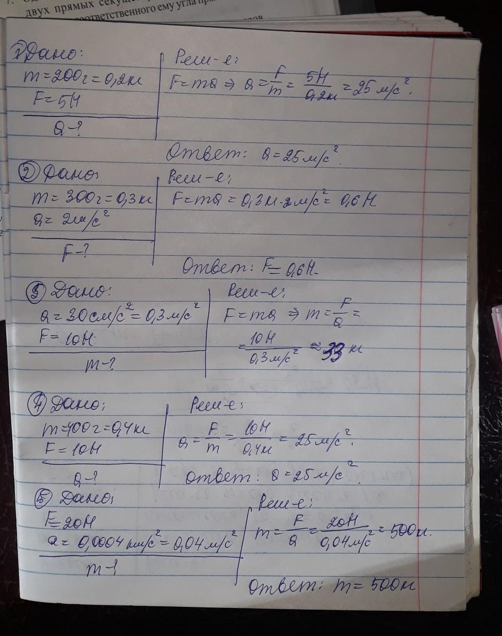 1. На тело массой m = 200 г действует сила F= 5 Н. Чему равно ускорение, с которым движется тело?