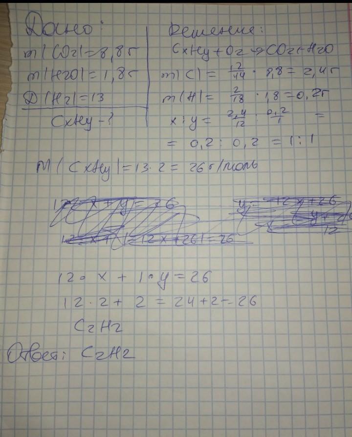 при сжигании углеводорода получили 8,8 г углекислого газа и 1,8 г воды. вывести молекулярную формулу углеводорода, если его относительная плотность по водороду равна 13.