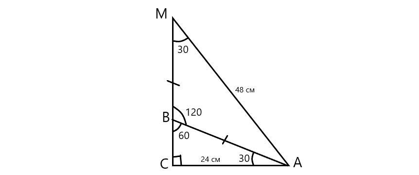 В прямоугольном треугольнике АВС угол С = 90 °, АС = 24 см, угол В - в 2 раза больше угол А. Катет ВС продолжили за вершину В на отрезок ВМ так, что ВМ = АВ. Найти АМ.