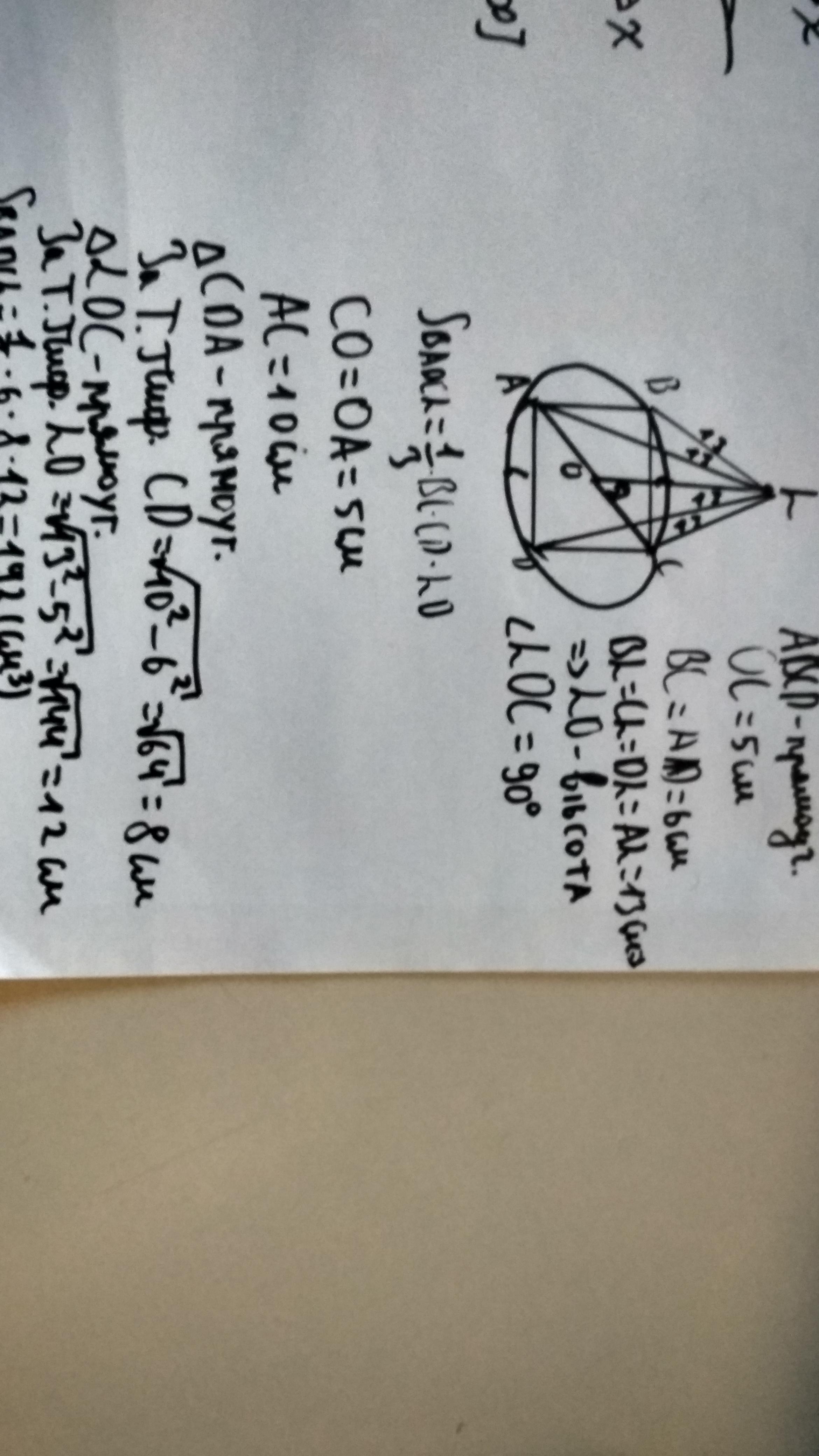 В основании пирамиды лежит прямоугольник, одина из сторон которого равна 6 см, а радиус окружности, описанной около него, равен 5 см. Все боковые ребра пирамиды равны 13 см. Вычислить объем пирамиды.