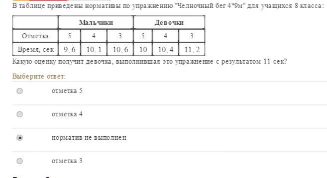 Она получит 3, потому как 10 это оценка 5, а она выполняла норматив дольше этого времени, до четверки она не дотягивает, поэтому результатом будет тройка (объяснила я кнш)))
