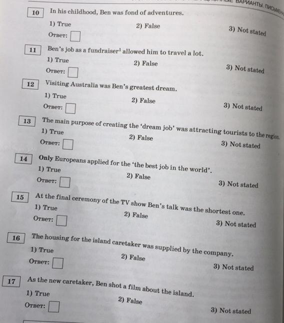 Помогите пожалуйста. Очень нужно. Прочитайте текст. Определите, какие из приведённых утверждений 10–17 соответствуют содержанию текста (1 – True), какие не соответствуют (2 – False) и о чём в тексте не сказано, то есть на основании текста нельзя дать ни положительного, ни отрицательного ответа (3 – Not stated). В поле ответа запишите одну цифру, которая соответствует номеру правильного ответа.