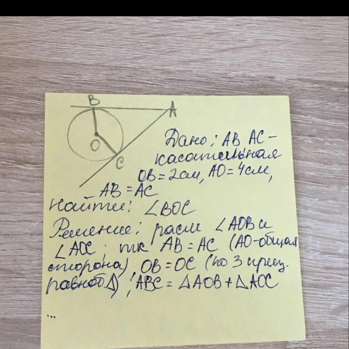 смотри, угол между касательной и радиусом т.е. АВ и ВО всегда равен 90град это значит что треуг. АВО прямоуг , рассмотрим угол ВОА
