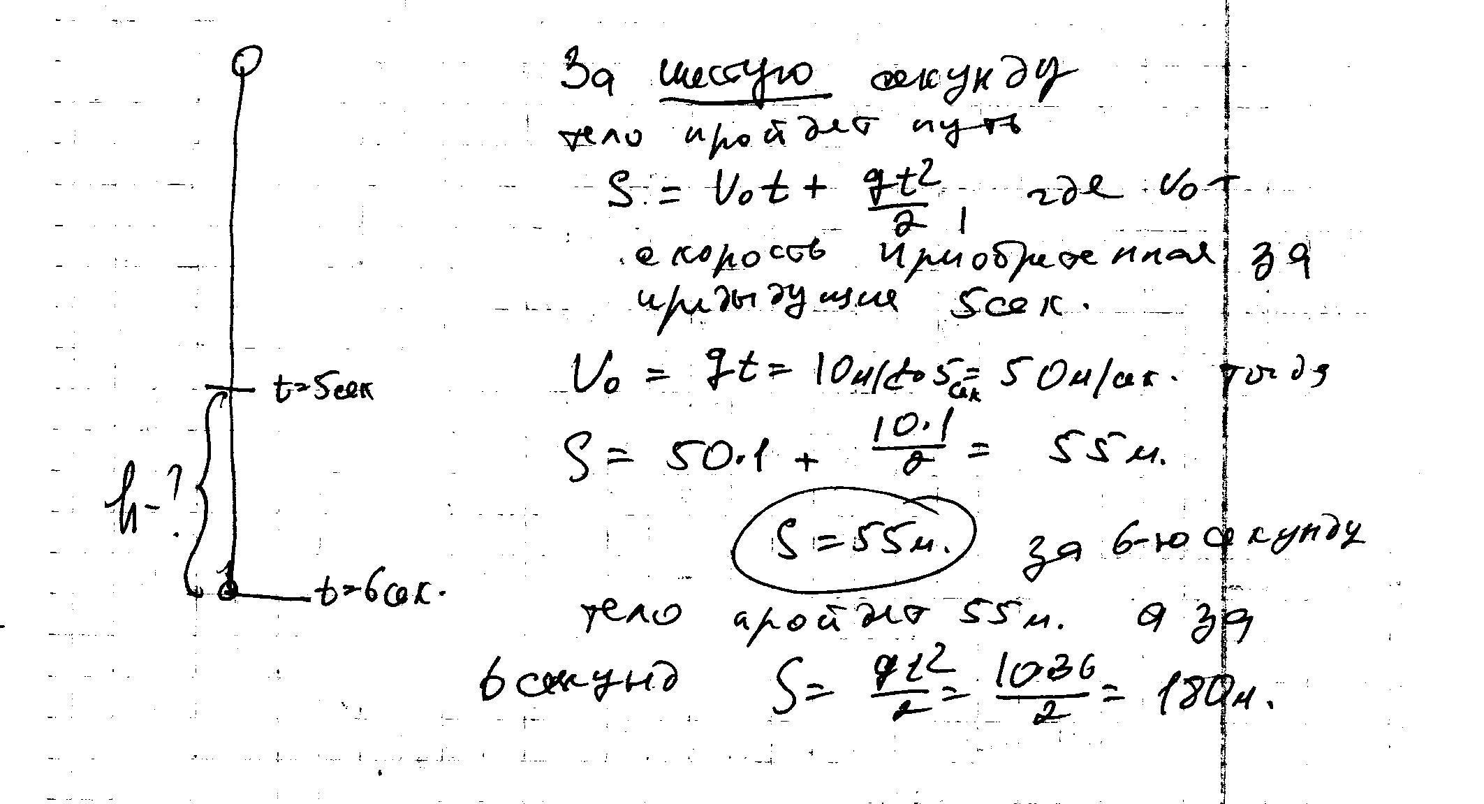 Какой путь пройдет свободно падающее тело за шестую секунду? v0=0м/с, ускорение свободного падения принять равным 10 м/с^2.