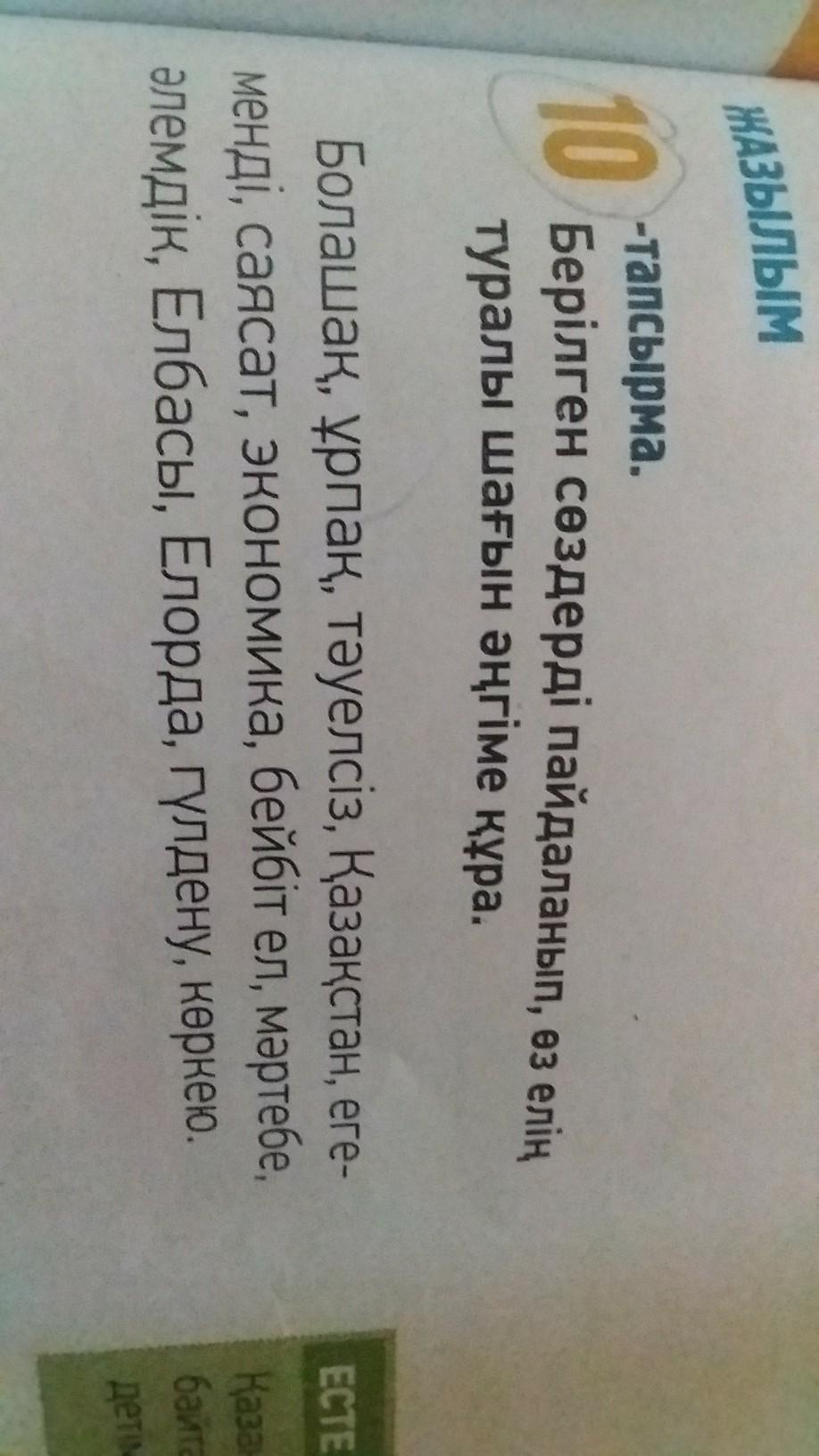 Төбесі көкке тірелген таулары бар, көк-жасыл орман-тоғайлары бар, асу-асу белдері бар, қойнауы алтын астық пен малға толған кең жазира даласы бар Қазақстан әлемге әйгілі өте бай ел. Ұлан - байтақ далада төсін кеңге жайған, табиғаты әр алуан жан -жануарларға толы, аққулы көлдері бар, тулаған толқынды теңіздері бар, әсем қалалары бар достығы жарасқан бейбіт елде тұрып жатқанымды мақтан етемін..
