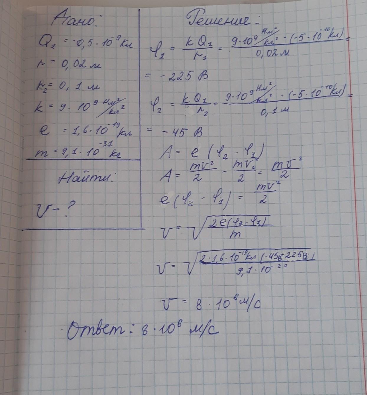 В некоторой точке находится неподвижный отрицательный заряд Q= –0,5 нКл. На расстоянии 2 см от него покоится электрон. Найдите скорость электрона, когда он будет находиться на расстоянии 10 см от неподвижного заряда (вследствие движения под действием электрического поля). Массу и заряд электрона найдите в таблице.