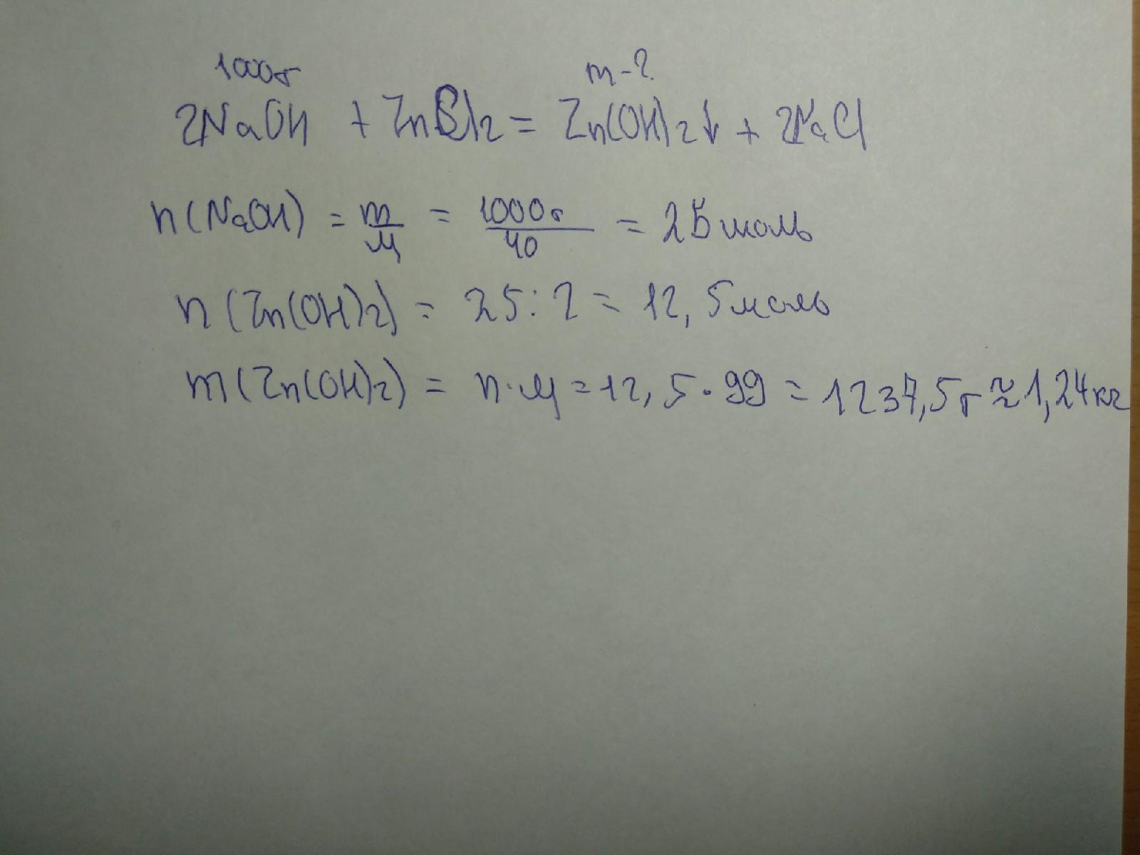вычислите массу осадка полученного при взаимодействии 1 кг гидроксида натрия с раствором хлорида цинка