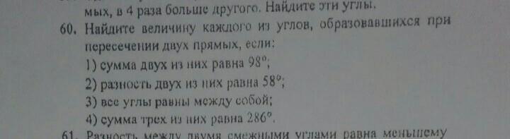2)Не могут быть вертикальными. значит, смежные. х+х+58=180, откуда х=61. т.е . два угла по 61°, тогда два других по 119°