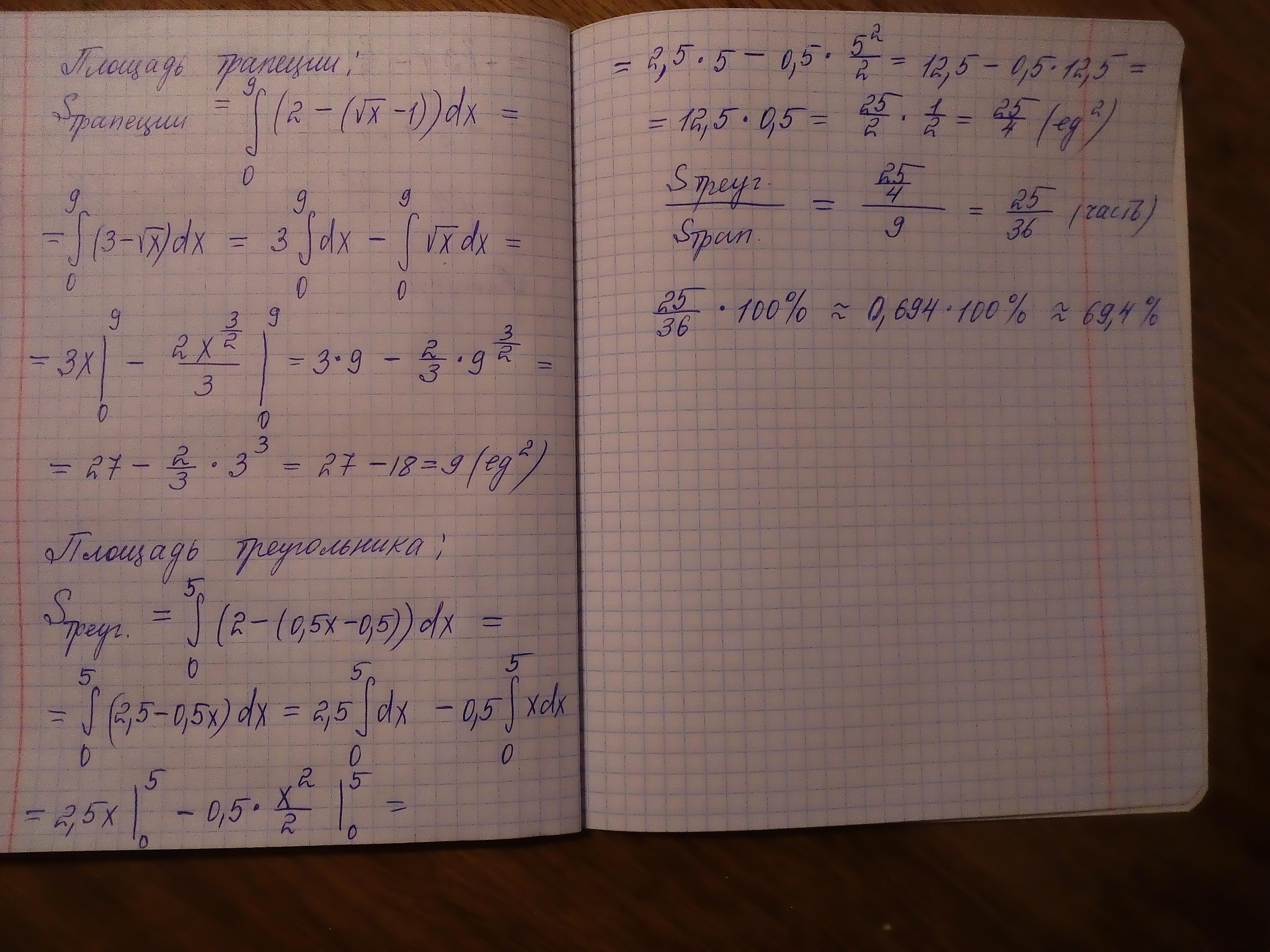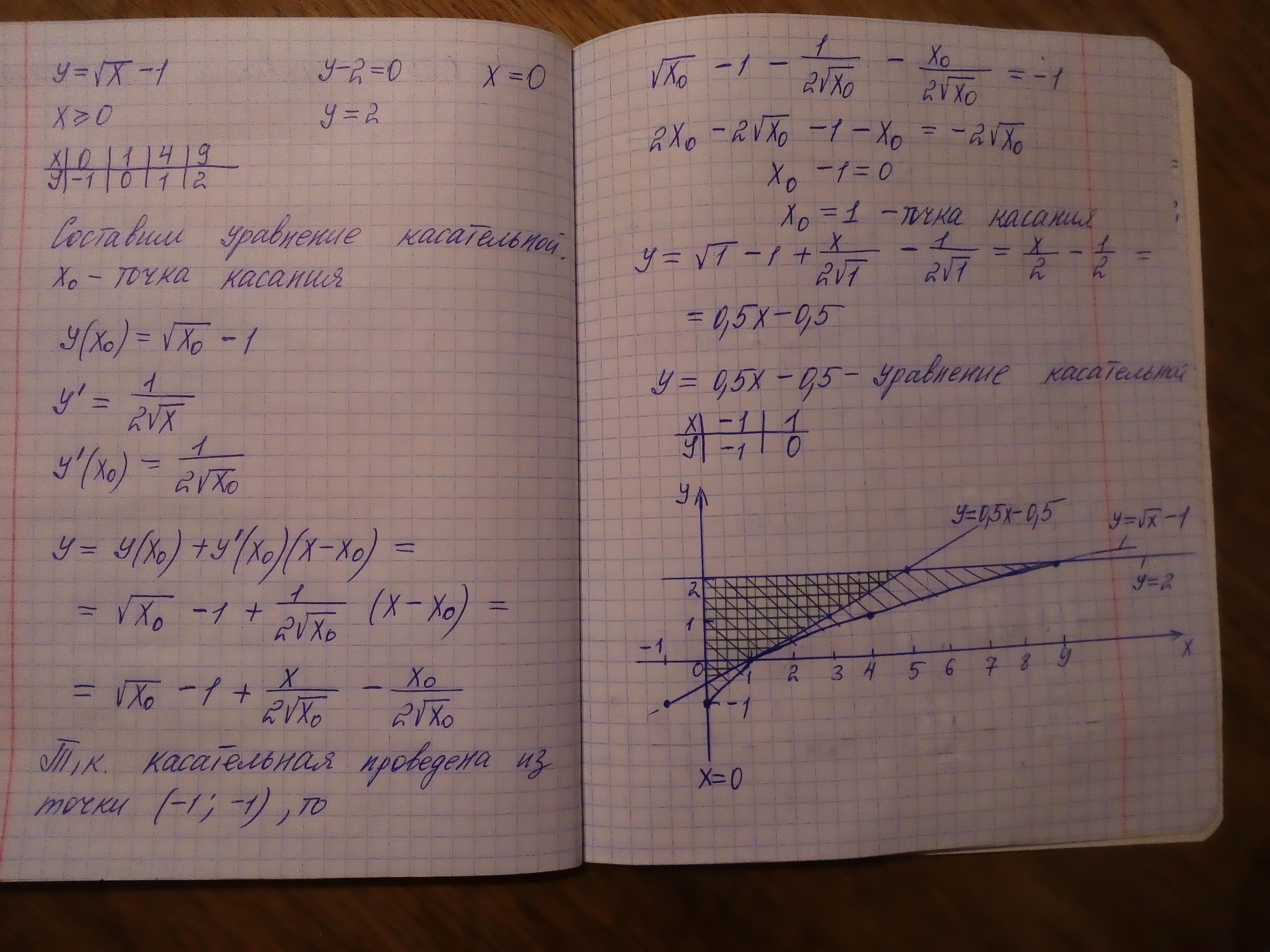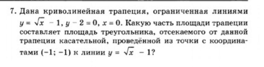 Дана криволинейная трапеция, ограниченная линиями y=sqrt{x} -1, y-2=0, x=0. Какую часть от площади трапеции составляет площадь треугольника, отсекаемой от данной трапеции касательной, проведенной из точки с координатами (-1, -1) к линии y=sqrt(x)-1 ?