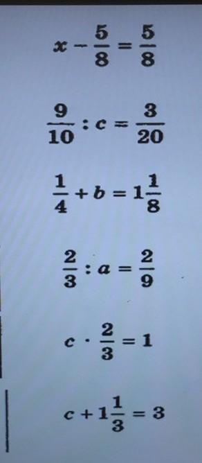 Пошаговое объяснение: х= 5/8+5/8= 10/8 х=1 2/8 =1 1/4 с=9/10:3/20 с= 9/10 * 20/3= 180/30=6 б=1 1/8-1/4 б= 9/8-2/8=7/8 с=1:2/3 с=3/2= 1 1/2 с=3-1 1/3 с=2-1/3 с=1 2/3