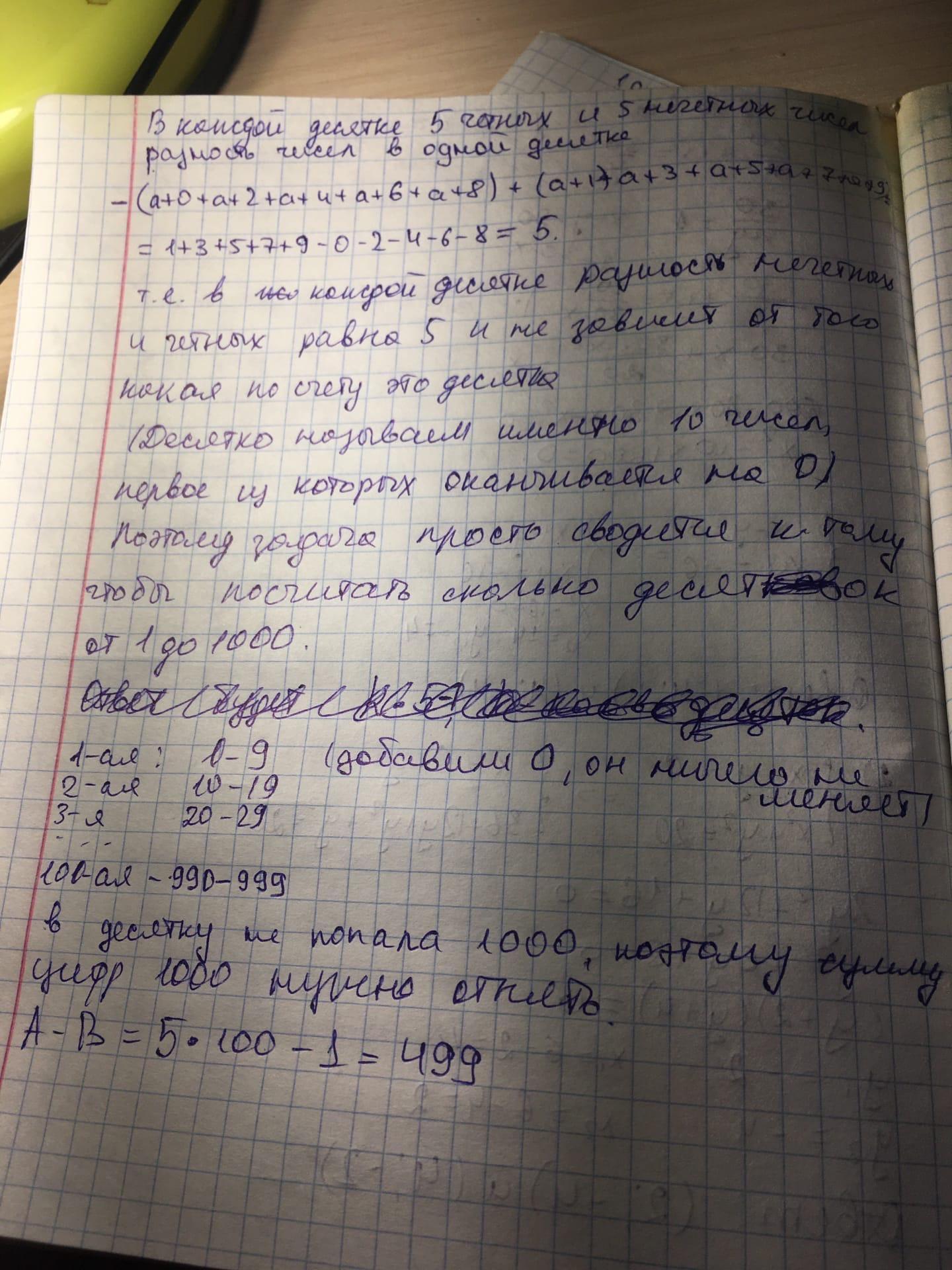 Все натуральные числа от 1 до 1000 включительно разбиты на две группы: чётные и нечётные. Пусть A — сумма всех цифр, используемых для записи нечётных чисел, B — сумма всех цифр, используемых для записи чётных чисел. Чему равно A−B?
