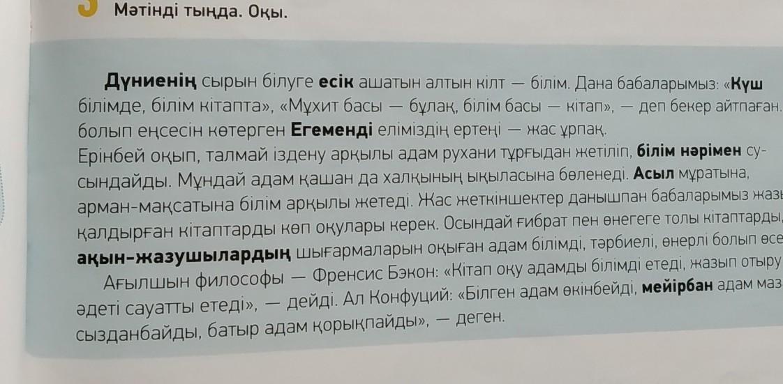 Дүниенің сырын ашу үшін білімді болу керек.Егеменді елімізді мақтан етеміз!Ақын-жазушылардың шығармаларынан рухани сусындайсың.Мейірбандық, жақсылық,қайырымдылық жасау-адамның үлкен мұраты емес пе?!