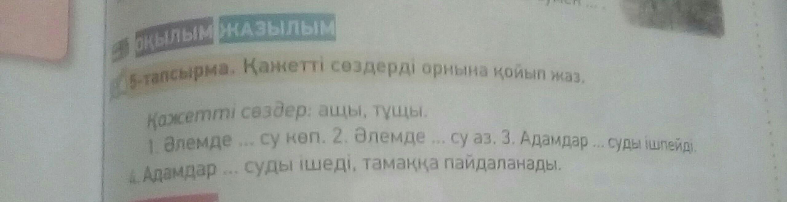 Әлемде ащы су көп.Әлемде тұщы су аз.Адамдар ащы суды ішпейді.Адамдар тұщы суды ішеді,тамаққа пайдаланады.