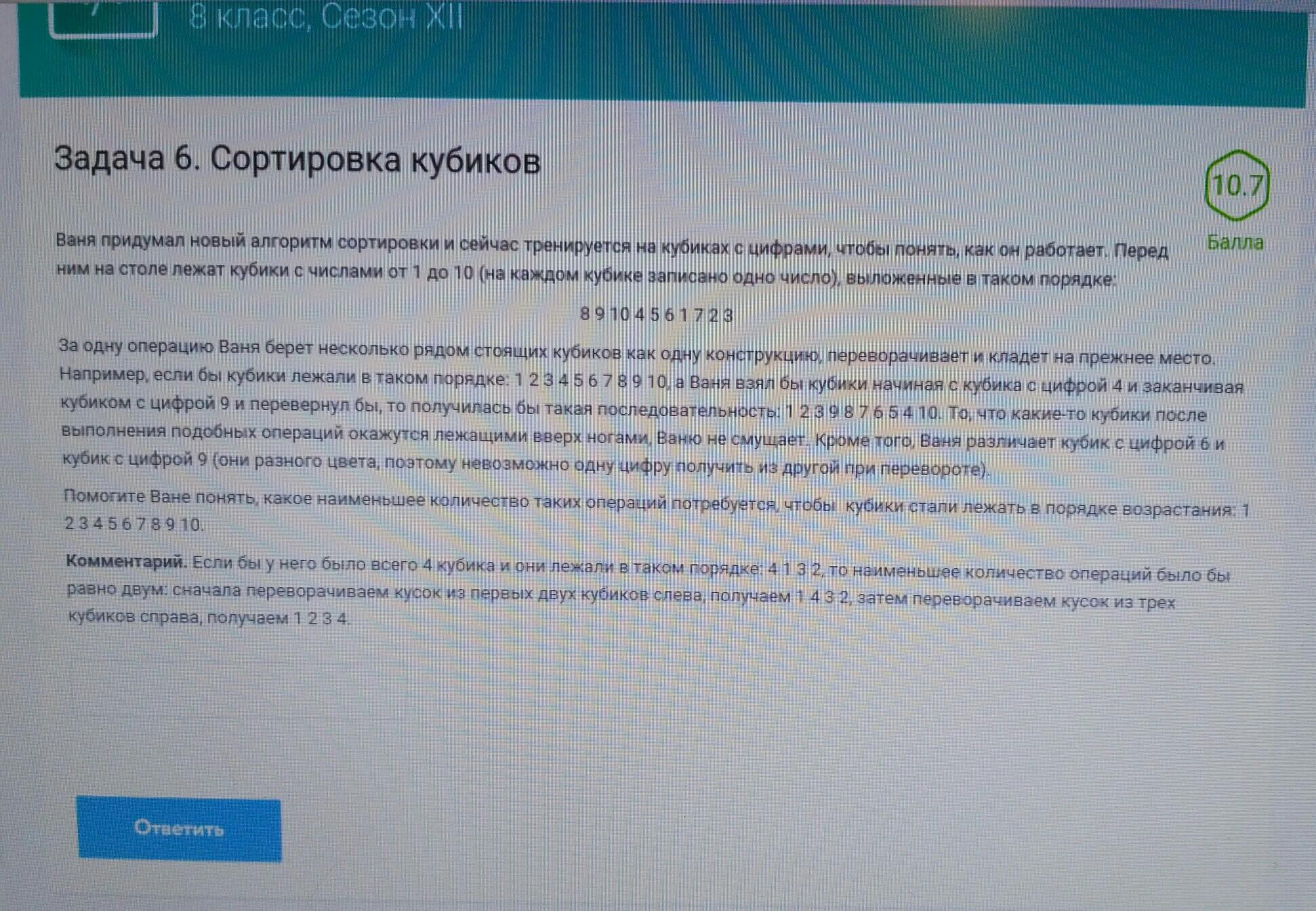 Помогите Ваня понять Какое наименьшее количество таких операции потребуется чтобы кубики стали лежать в порядке возрастания: 1 2 3 4 5 6 7 8 9 10.