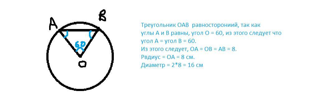 Градусная мера дуги AB равна 60 градусов найдите длину диаметра окружности если известно что длина хорды AB равна 8 см