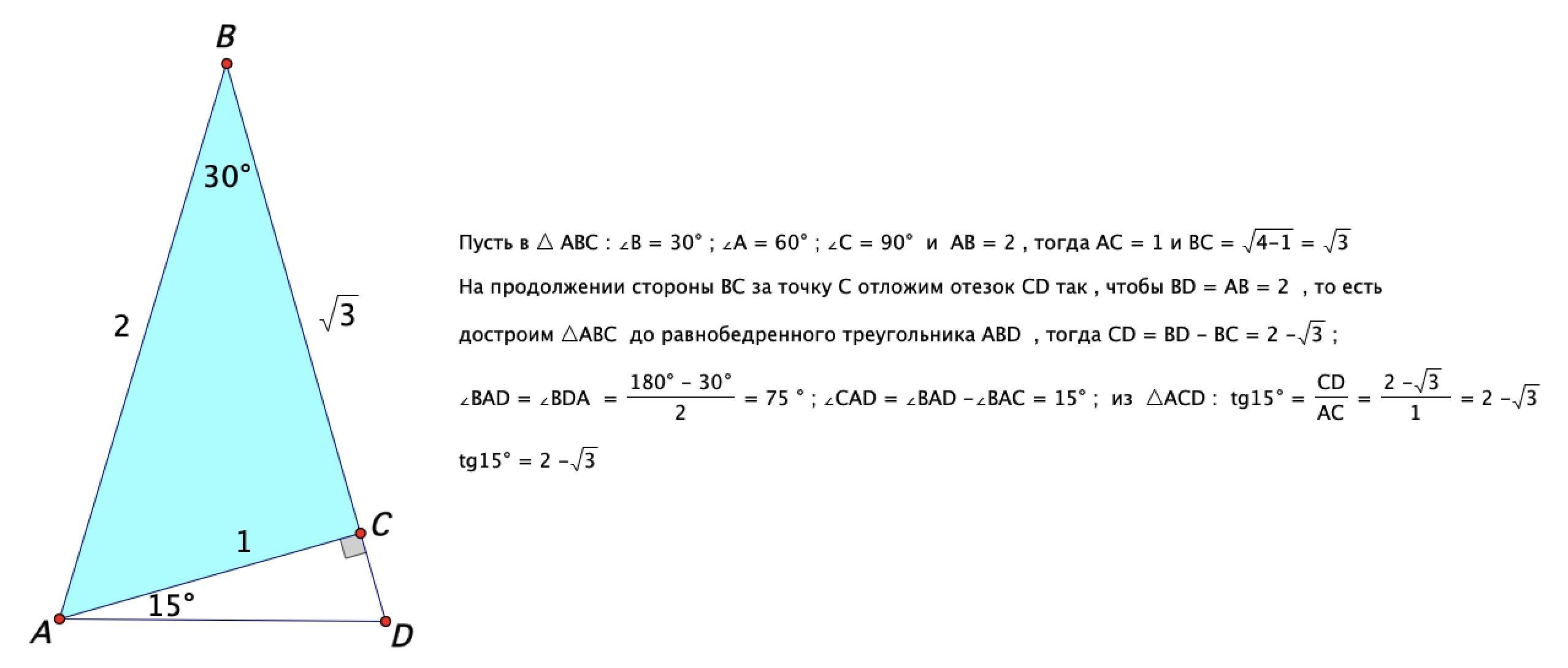 Получили: у:(х√3)=(2-√3), но слева стоит отношение, которое определяет tg15°. Требуемое доказано.