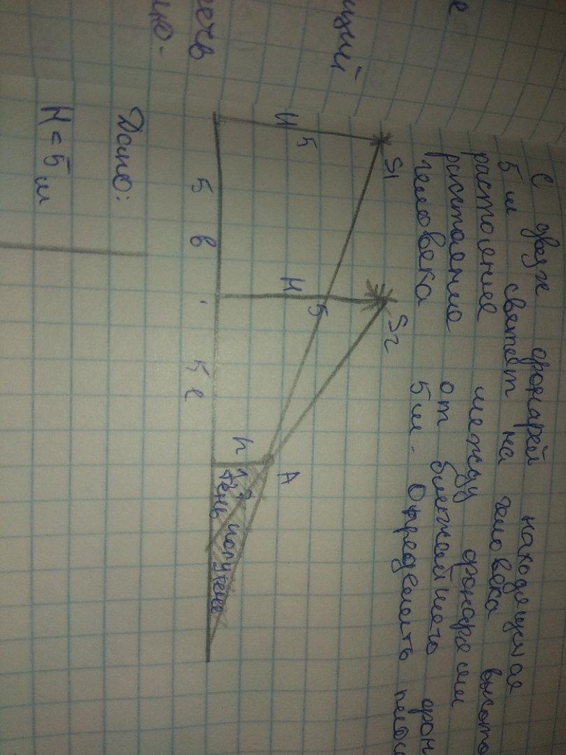 С двух фонарей высотой 5 метров падает свет на человека ростом 1,7 метров. Расстояние между фонарями 5 метров и расстояние от ближайшего фонаря до человека 5 м. Найти площадь полутени.
