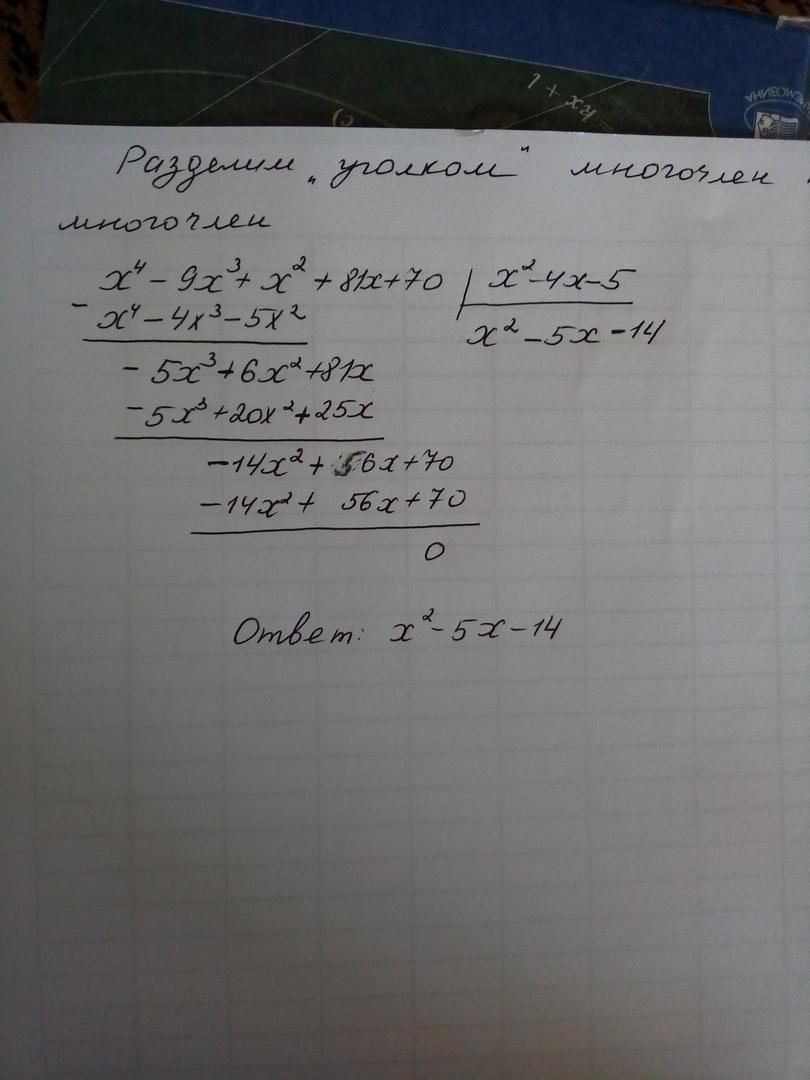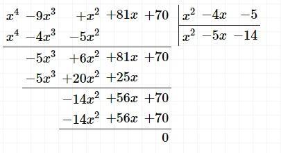 Выполнить деление многочлена  х^4 – 9х^3 + х^2  +  81х + 70 на многочлен  х^2 – 4х – 5