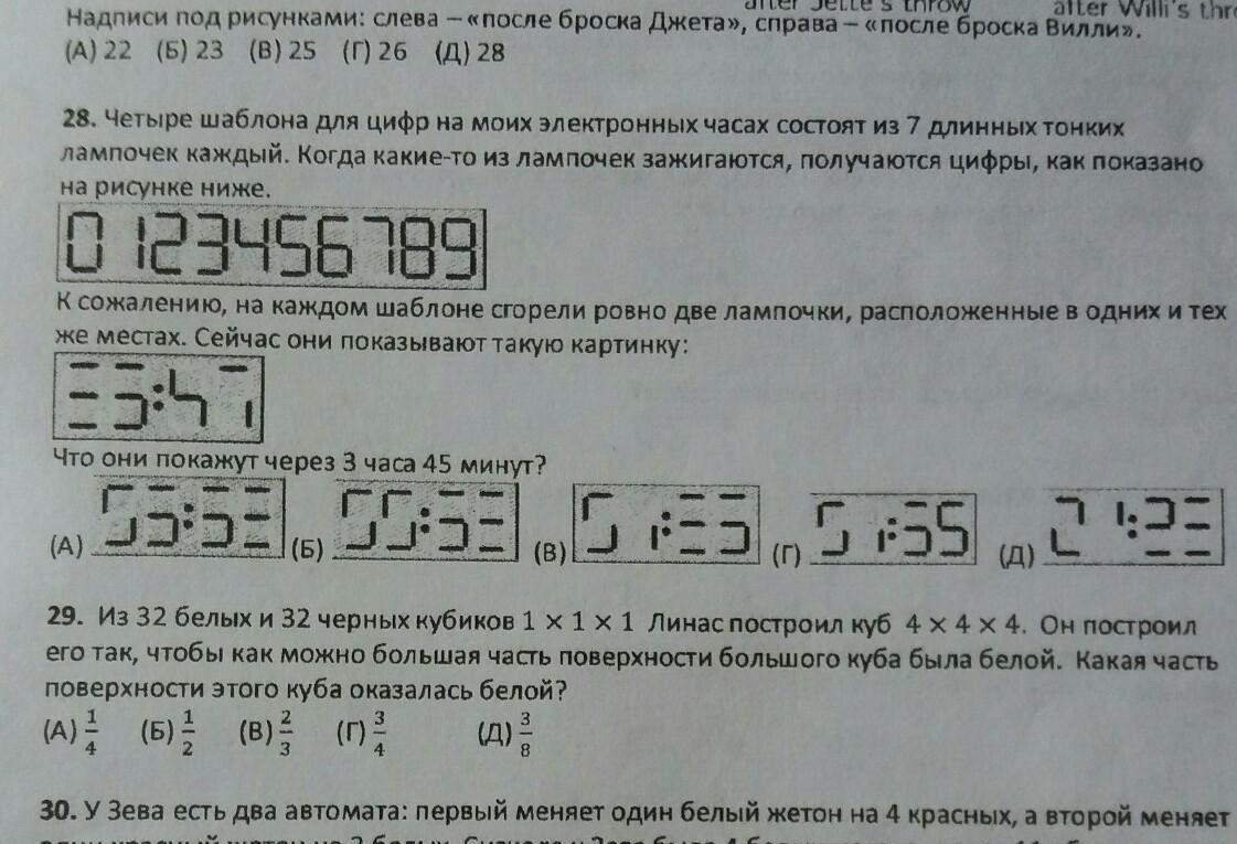 Ответ:вариант А. т.к. перегорела боковая верхняя правая и боковая нижняя левая. сейчас 23:47, через 3часа 45минут будет 03:32