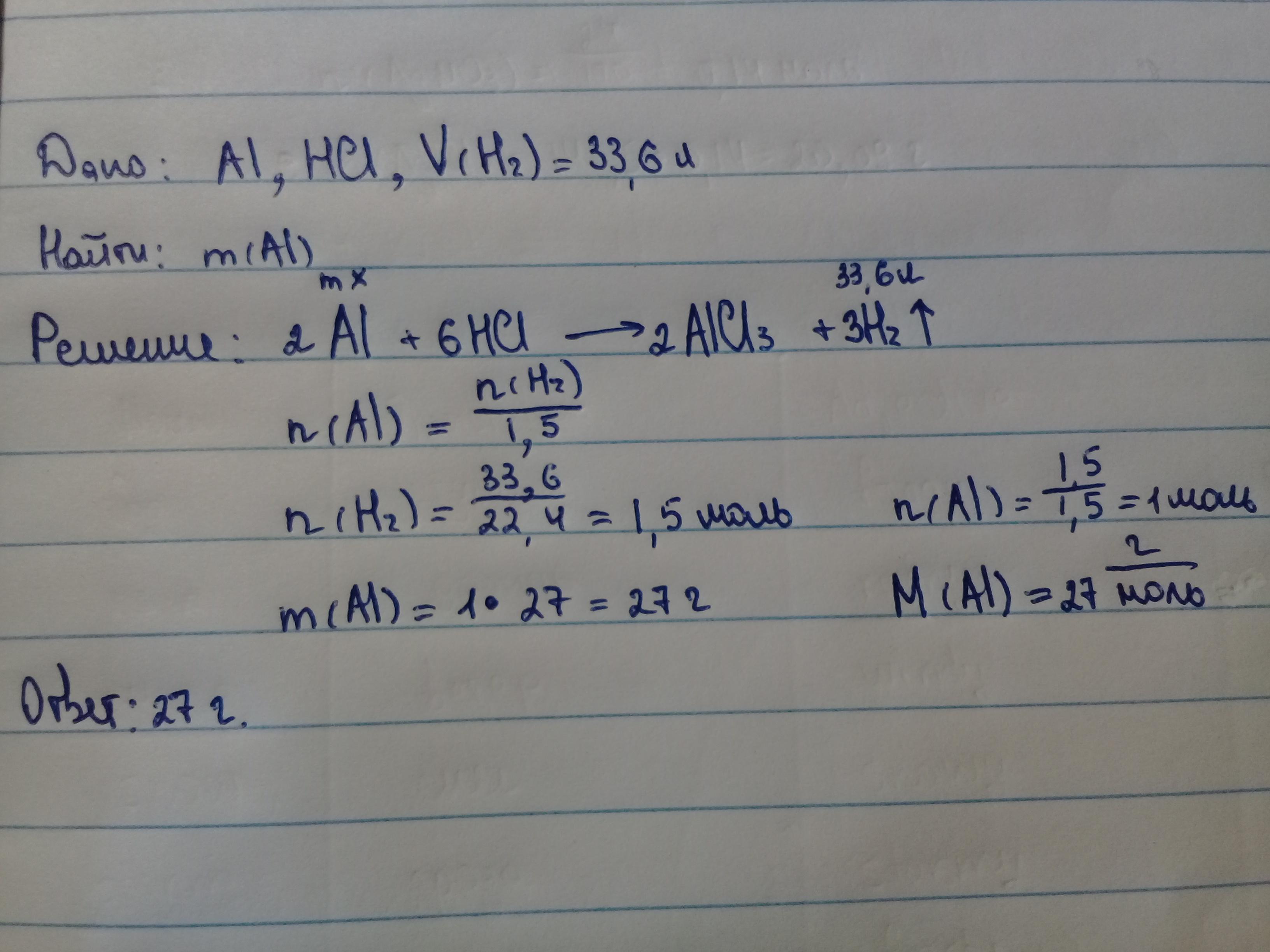 Рассчитайте, какое количество вещества алюминия растворили в соляной кислоте, если при этом выделилось 33,6 л водорода (н.у.). Вторым продуктом реакции является хлорид алюминия.