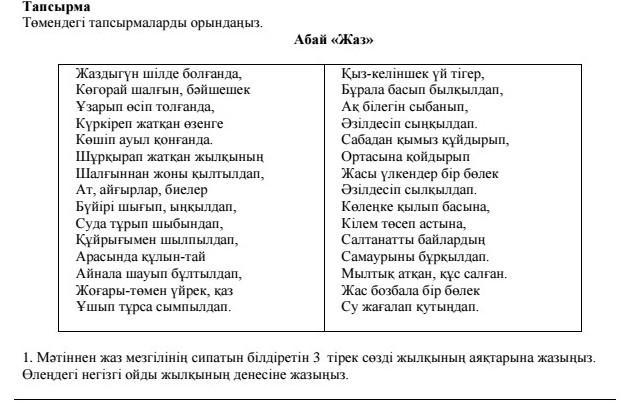 Ен бириншиден осы оленди тусиниктеп окимыз, сосын жылкы туралы айтылган Олен жолдарын тауып алганнан кейин осы уш тирек созди тауып алып жаза саласын. Болды.