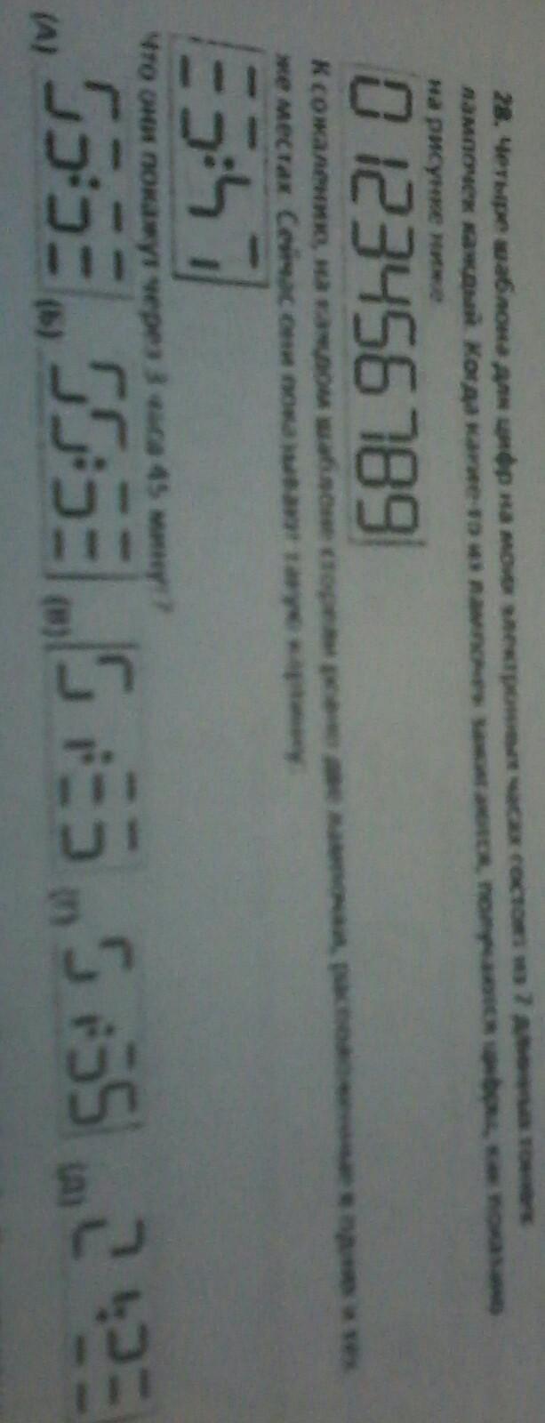 четыре шаблона для цифр на моих электрических часах состоят из семи длинных тонких лампочек каждый.Когда какие-то из лампочек зажигаются,получается цифры,как показано на рисунке.
