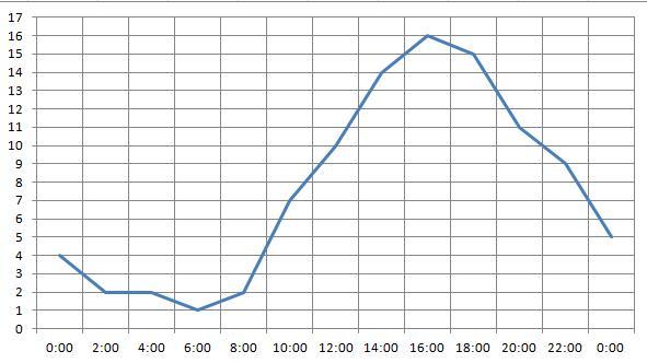 На рисунке показано, как изменялась температура воздуха на протяжении 1 мая 2018 года в городе Екатеринбурге. По горизонтали указано время суток, по вертикали — температура в градусах Цельсия. Найдите разность (в градусах Цельсия) между наибольшим значением температуры и наименьшим.
