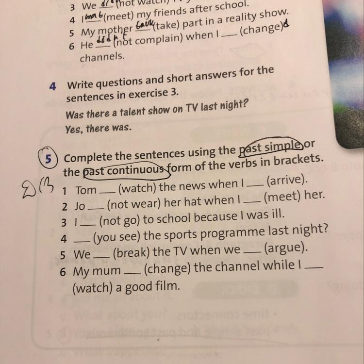 1 was watching/arrived 2 wasn't wearing/met 3 didn't go 4 did you see 5 broke/ were argueing 6 changed/ was watching
