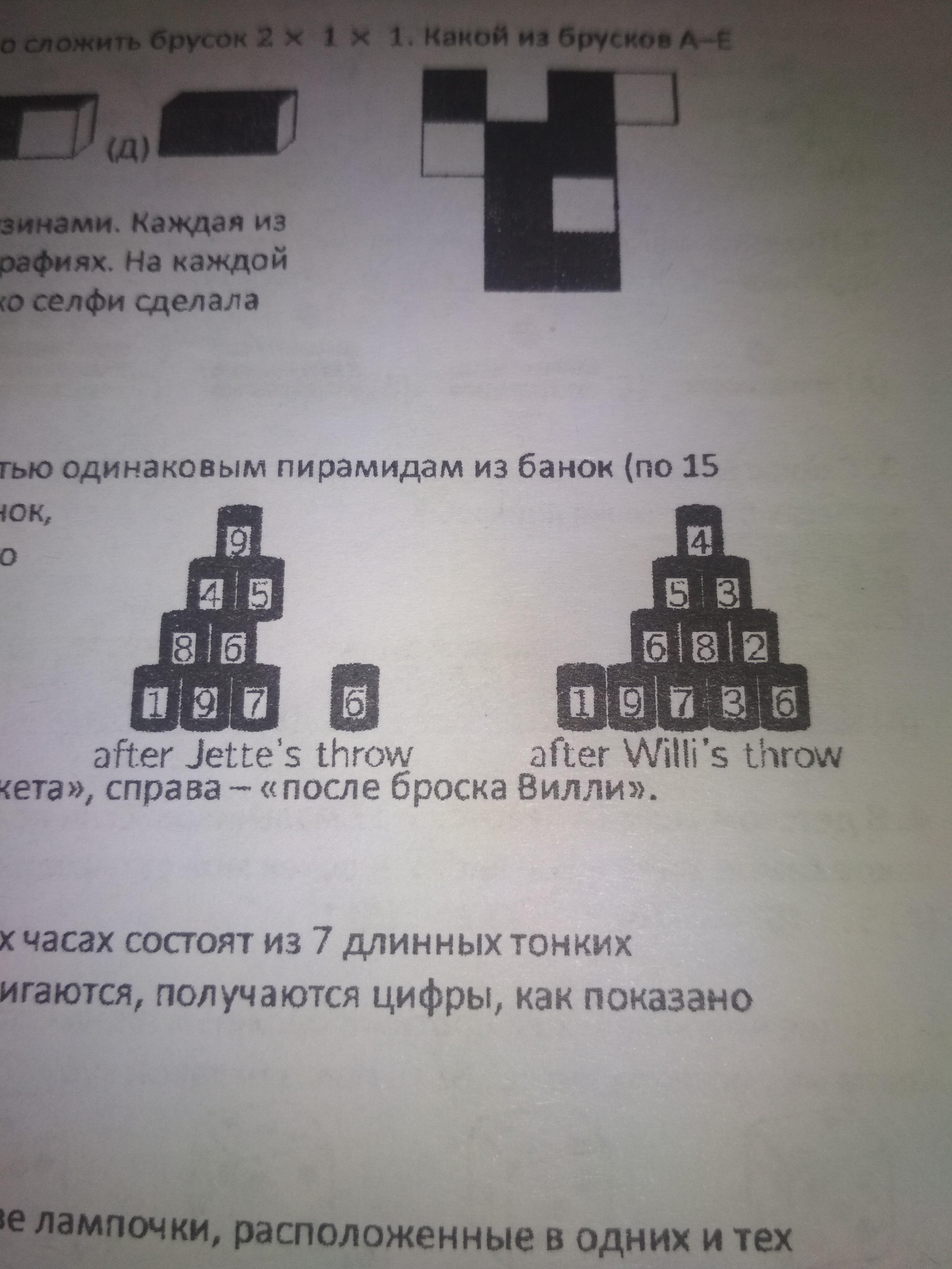 Джет и Вилли бросали шары по двум полностью одинаковым пирамидам из банок (по 15 банок в каждой). После того как Джет сбил 6 банок, а Вилли сбил 4 банки, от пирамид осталось то, что показано на рисунках. За каждую сбитую банку начисляется столько очков, какое число на ней написано. Джет получил 25 очков. Сколько очков получил Вилли?