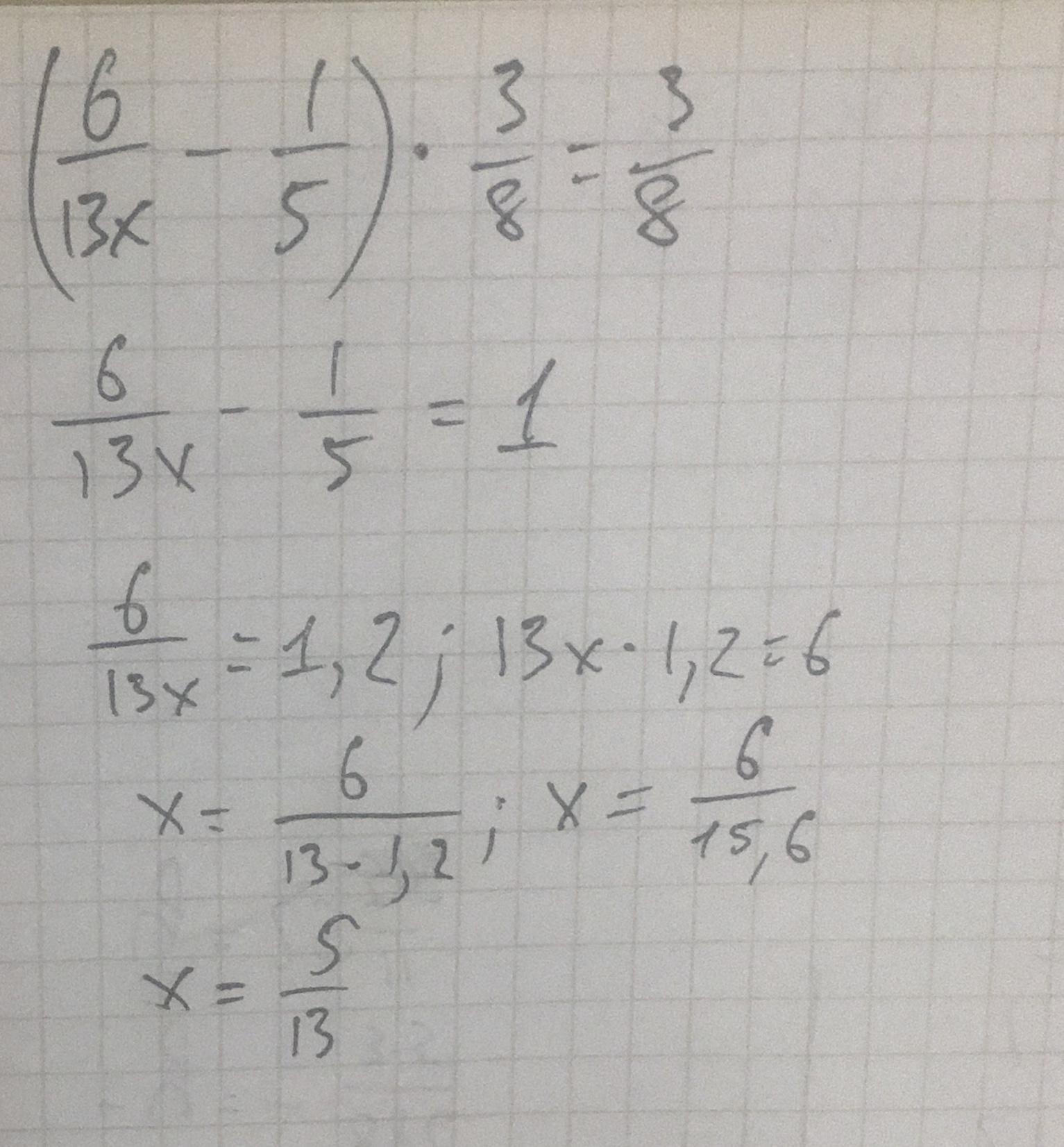(6/13x-1/5)*3/8=3/8, x не равен 0 . 9/52x-3/40=3/8 . 9/52x=9/20 . 52x=20 . x= 5/13 , x не равен 0. x = 5/13