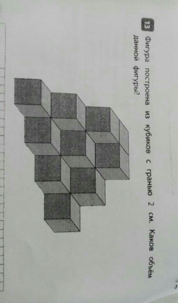 Смотрим сверху вниз: 3 кубика, 3+3=6 кубиков, 6+4=10 кубиков, всего 3+6+10=19. Объем одного 2*2*2=8см³, тогда полный объем фигуры 8*19=162 см³